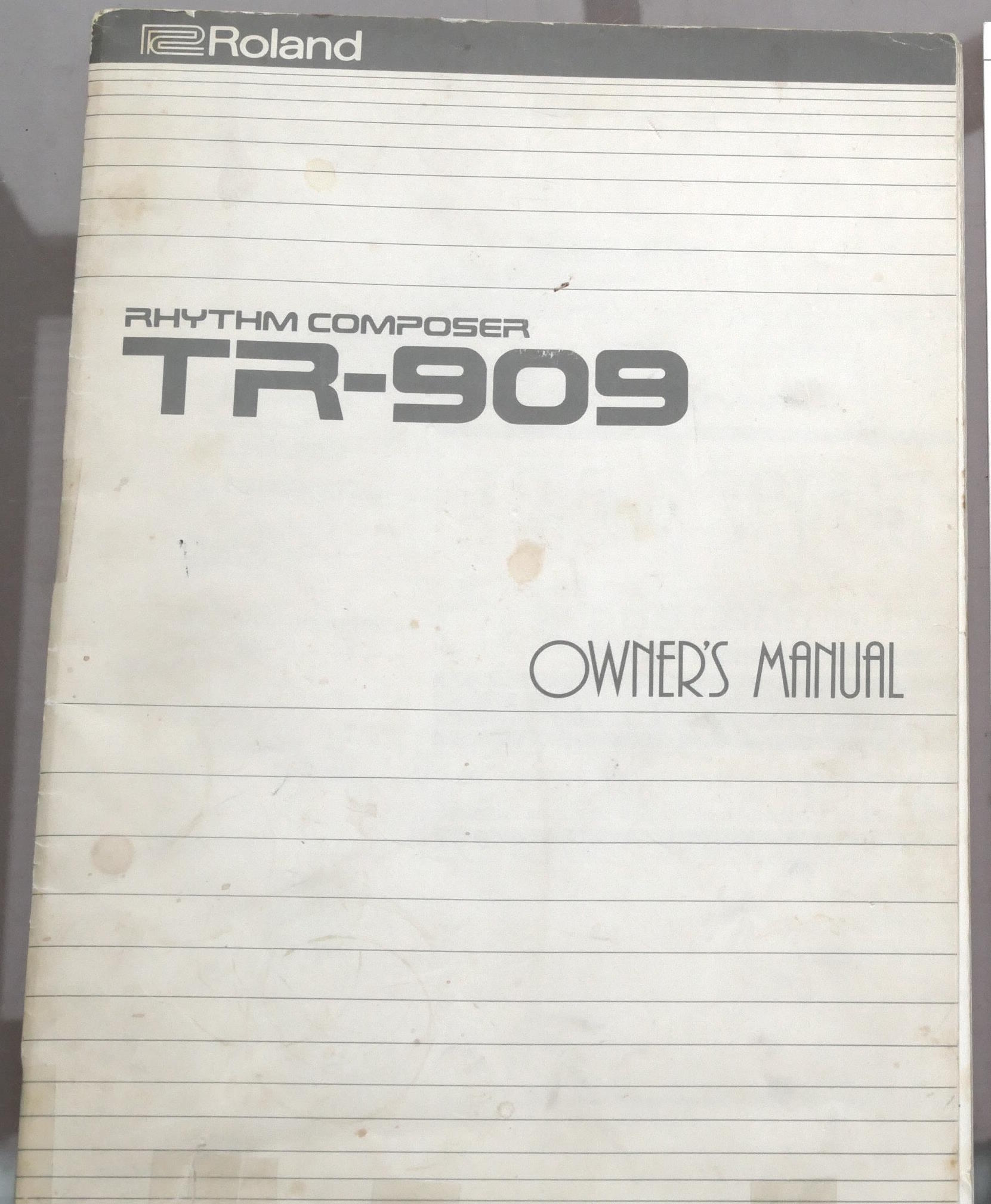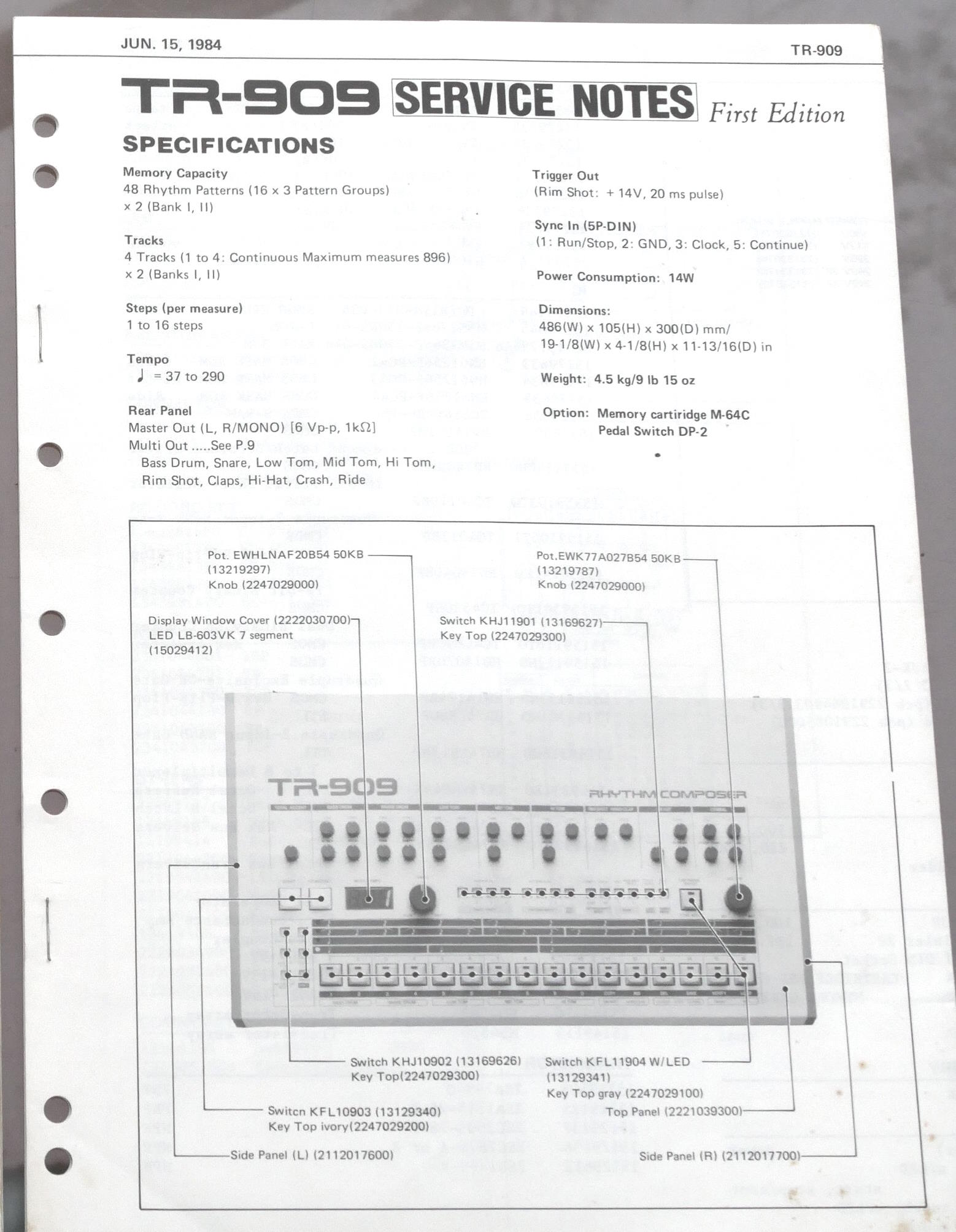 Original user manual and service notes for the TR-909. The user manual is very solid and complete. It has had minor little repairs done extremely well. No staples but no sign of rust where they were. The cover is grubby, and the whole manual is probably 6.5 / 10 cosmetically. The service notes are very good, with massive foldouts (often in colour) looking immaculate. It is still stapled. |