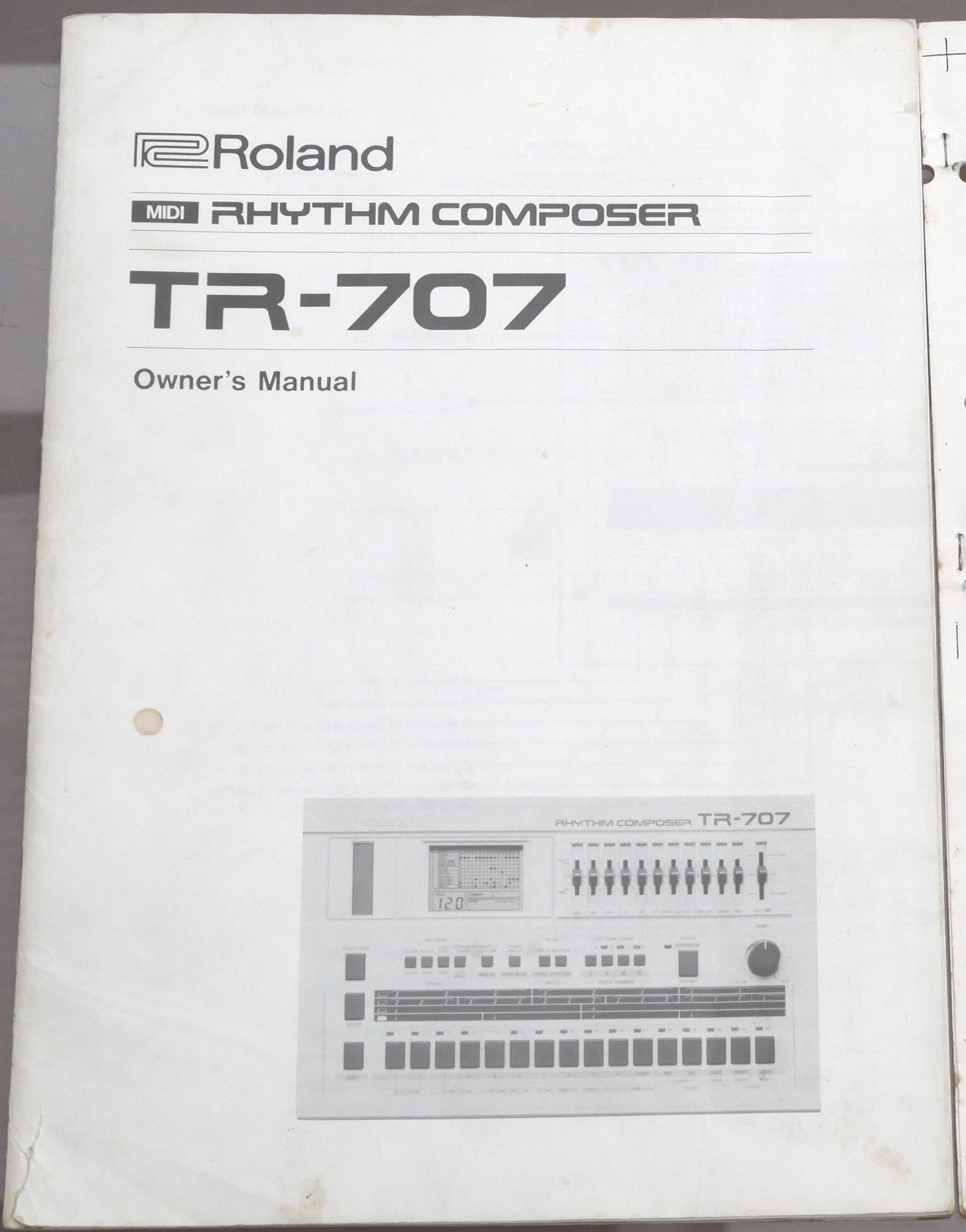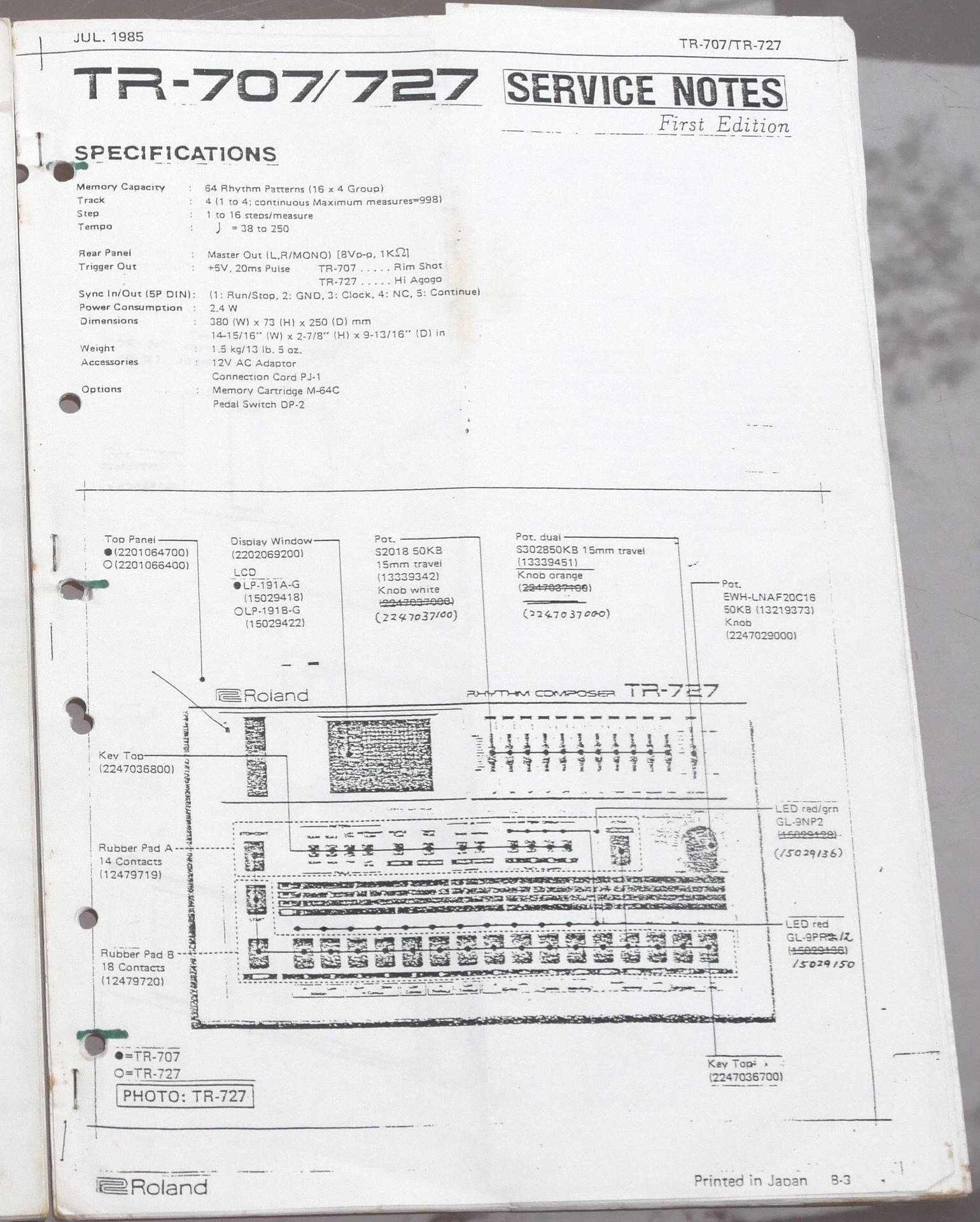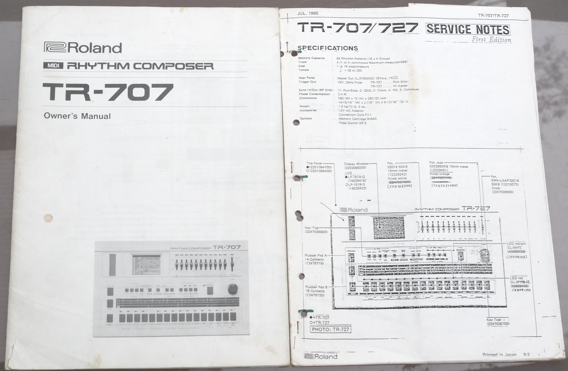 52-page original owner's manual for the TR-707, in English. In generally very good condition including the fold-out page. Plus photocopied service notes for this (and the 727). These have had someone have a go at their left edge with a hole-punch in a seemingly random attack - a shame, as otherwise the whole notes are in reasonable condition, including the foldouts - possibly a Roland copy if they ran out of originals. |