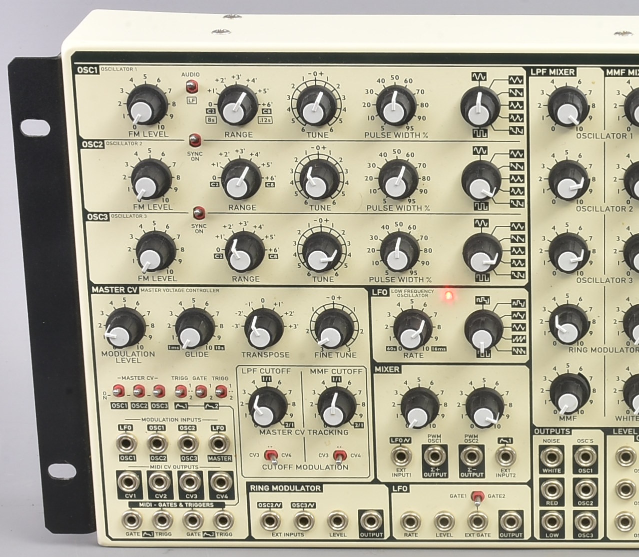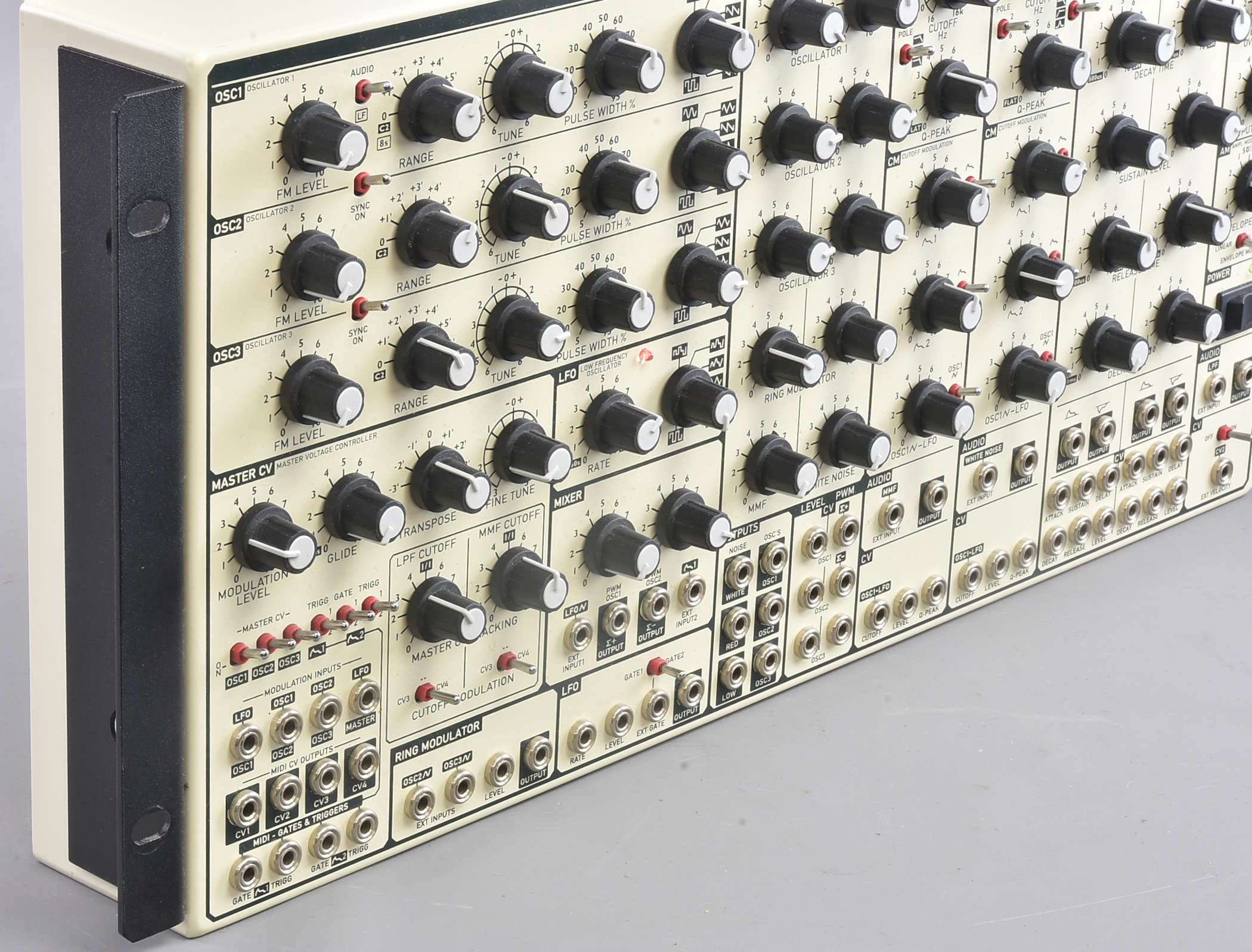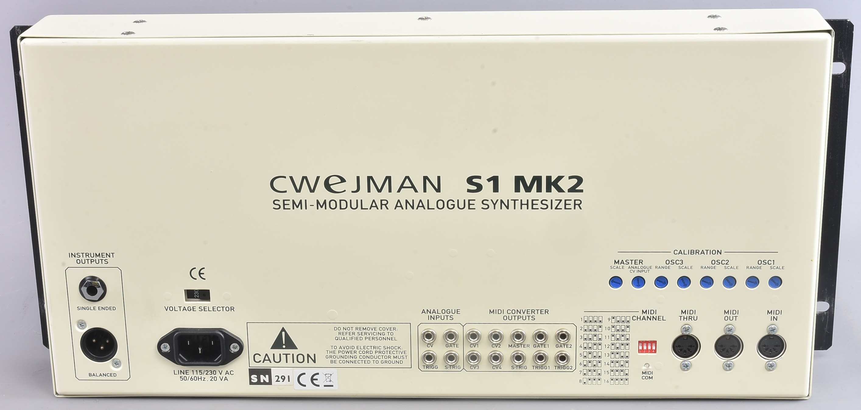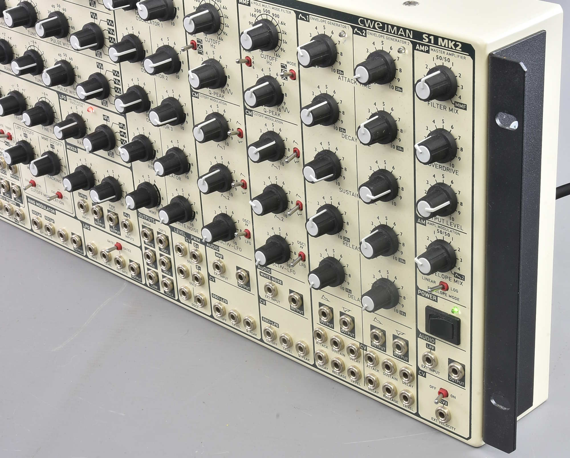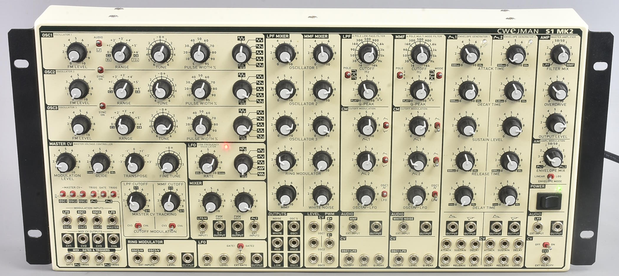 Beautiful Cwejman S1 Mk2 semi-modular analogue synthesizer. Rare and sought-after, of course. This gorgeous near-mint cream / eggshell coloured version is serial number 291. Thorough checking shows that the PWM range of one oscillator is much lower than the other, but otherwise everything seems exactly as it should be. Packing 12GBP to include a UK or Euro IEC mains lead. |