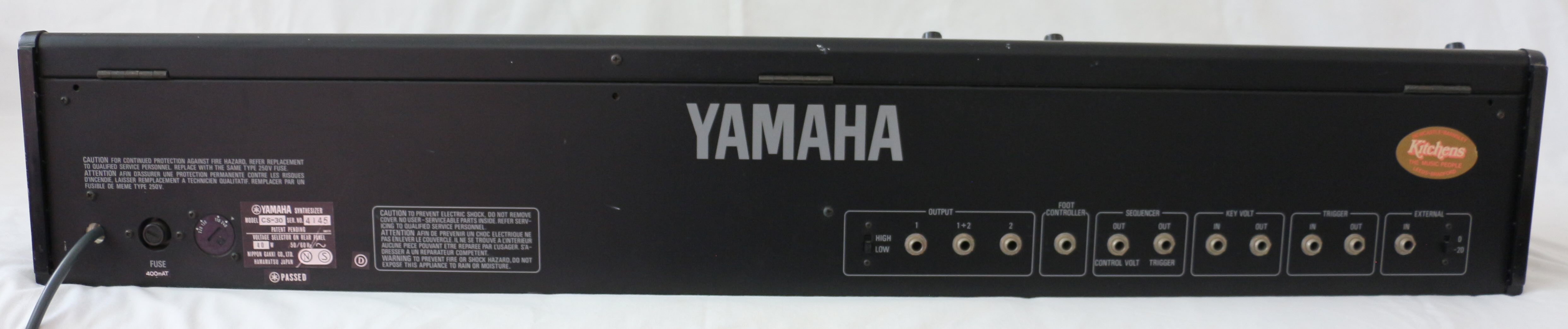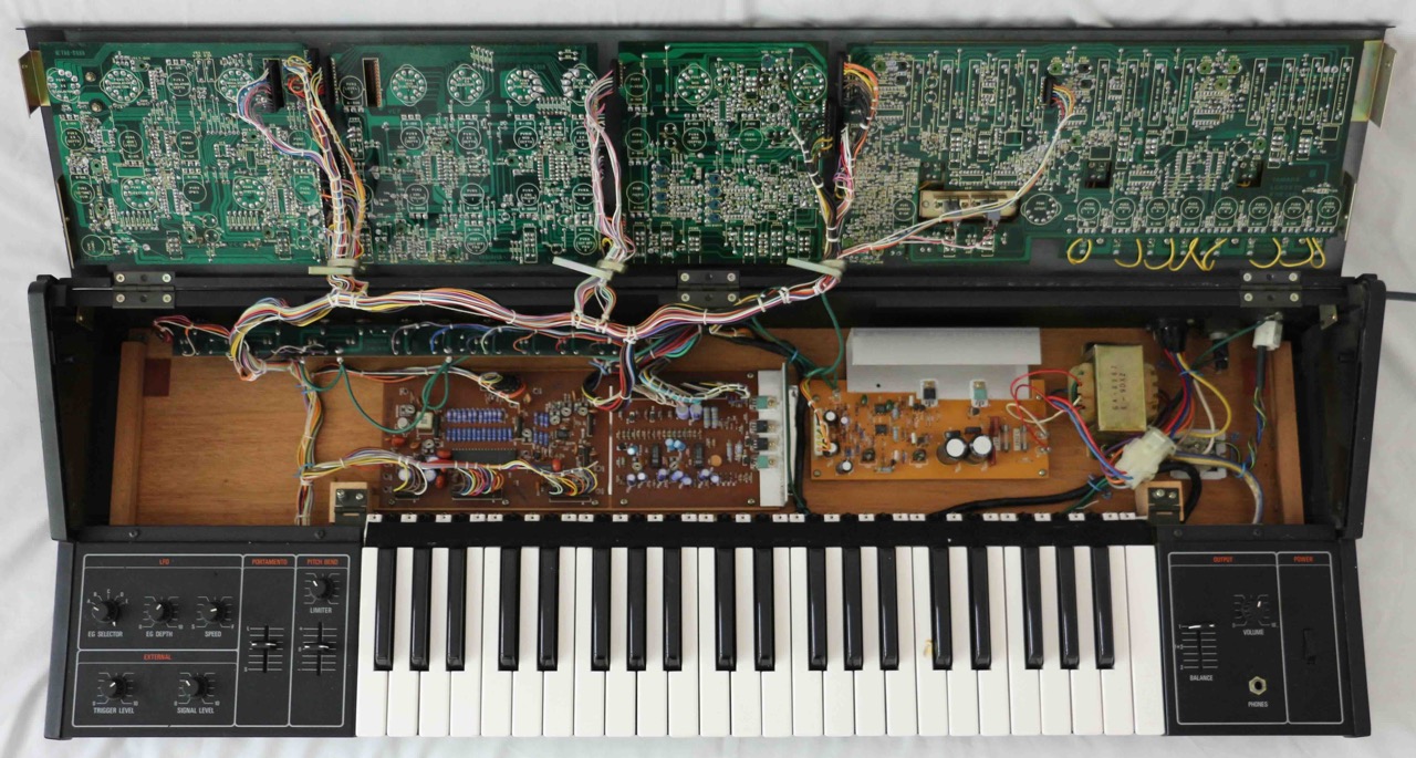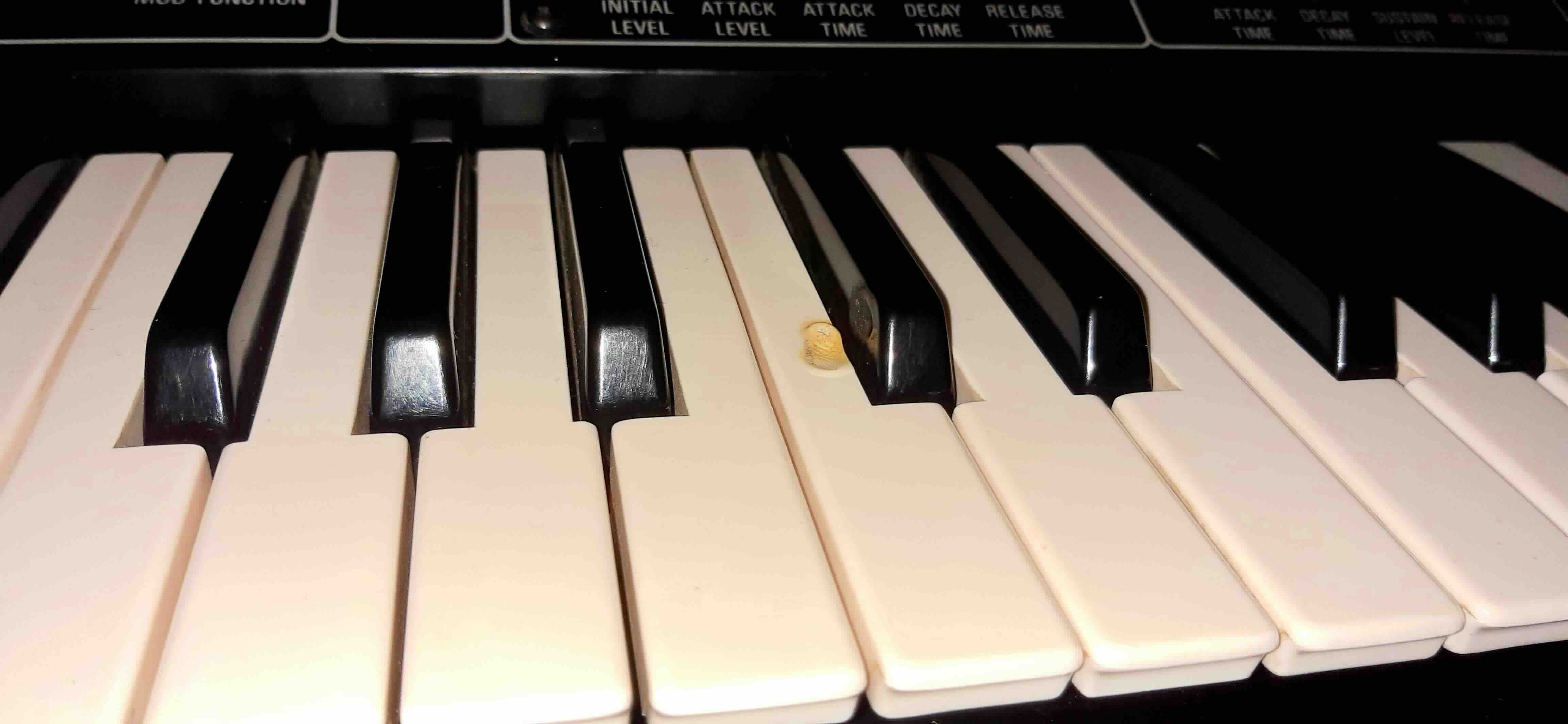 Cosmetically the synth is in pretty good shape with nothing broken or missing. There are lots of very small dots of blistered paint, some with a hint of surface rust. The most noticeable ones are at the top of the control panel but these have not increased in size or number over the past decade-or-so. They don't look too bad, in my opinion. Inside is clean and dry with no signs of damp. One of the C keys has a cigarette burn (WHY??!!!) which has melted the plastic slightly. However, all keys are secure and function correctly. The case has a few marks here and there, but overall it looks good.
