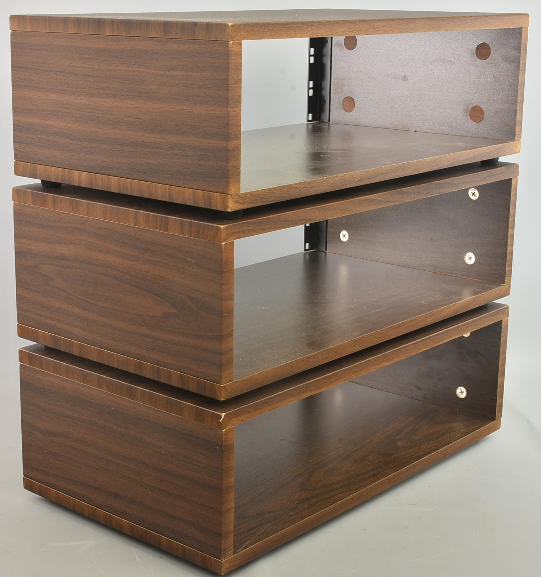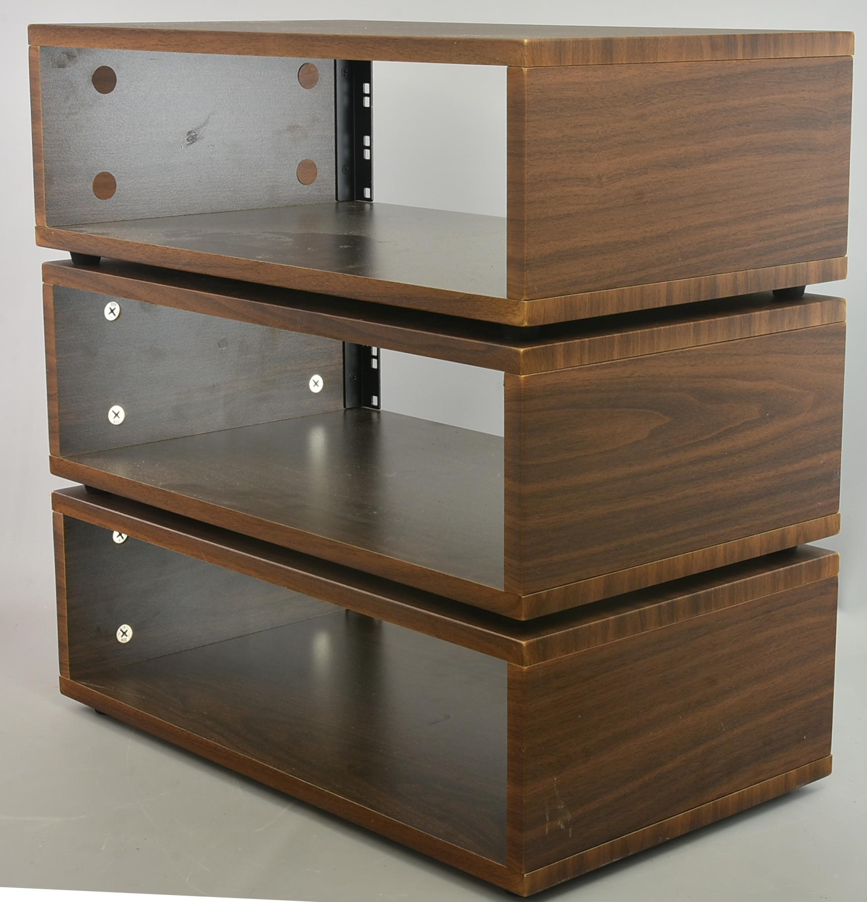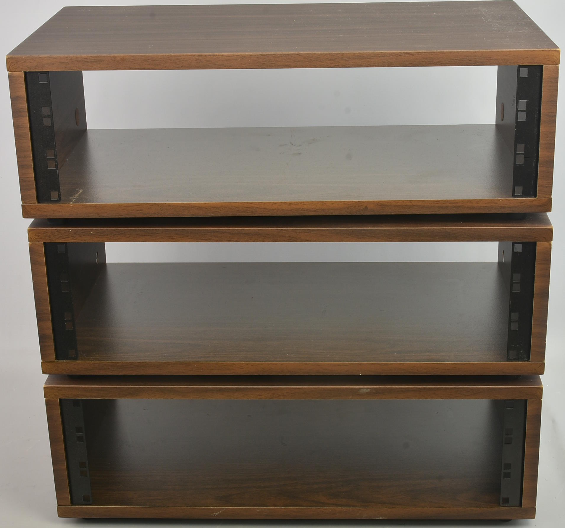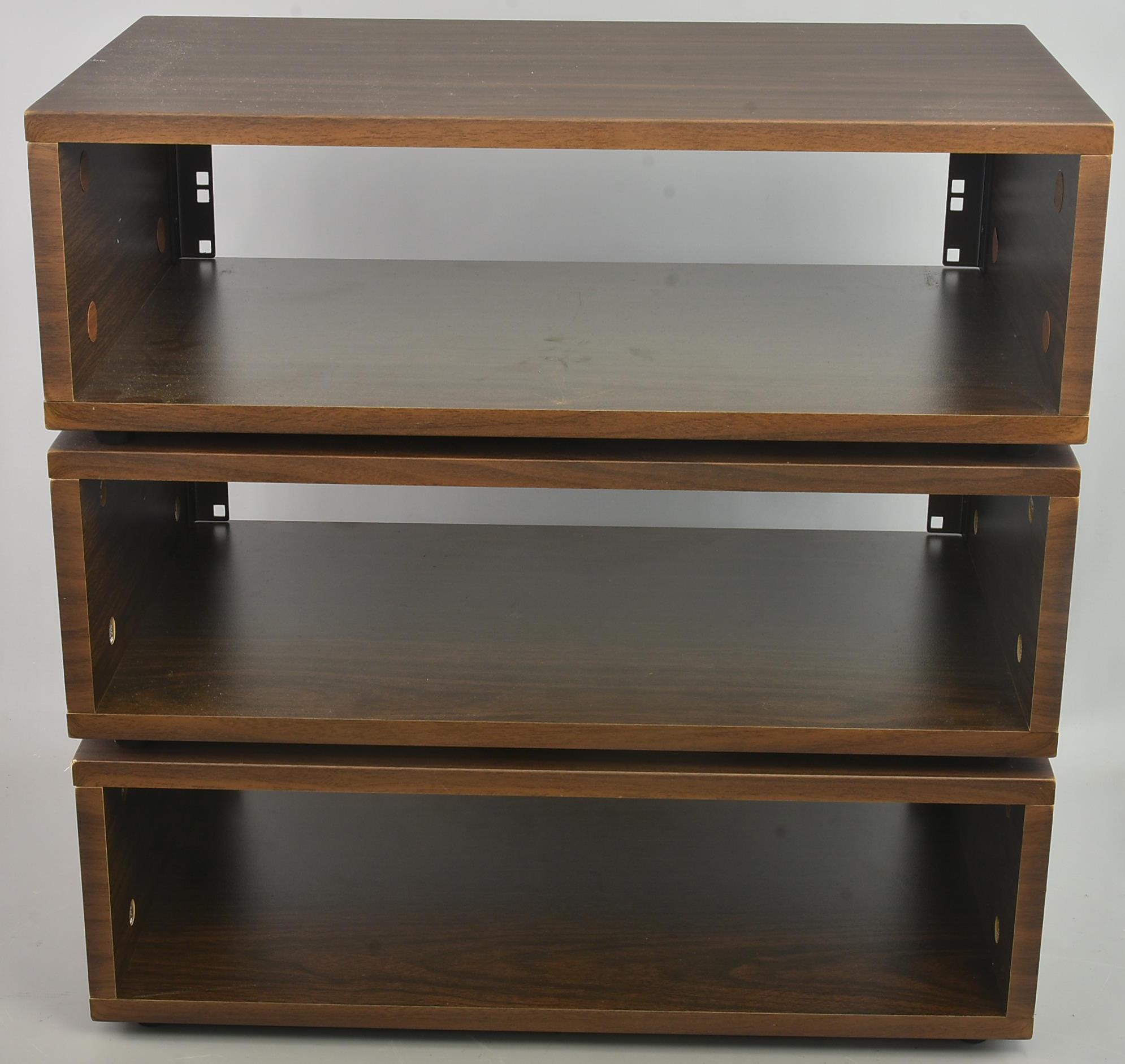 Three very good condition wood-effect 19-inch equipment racks. Packing 12GBP. |