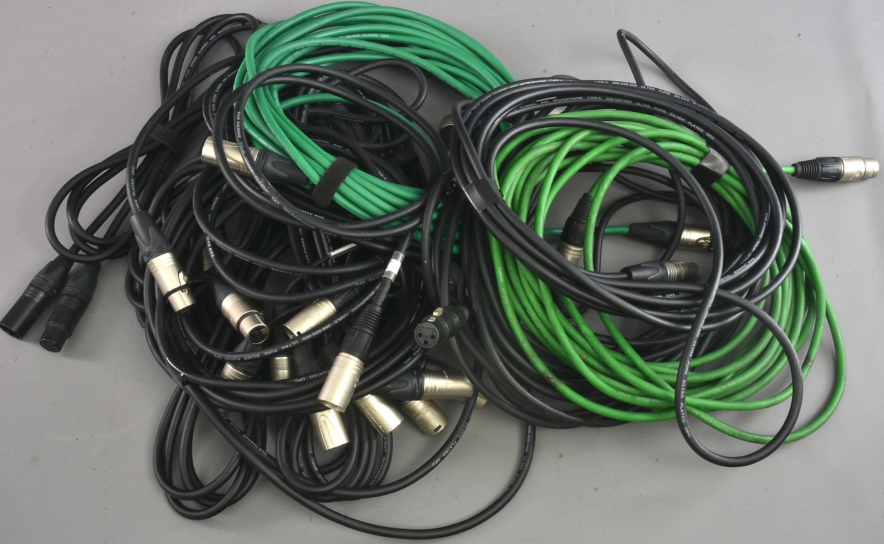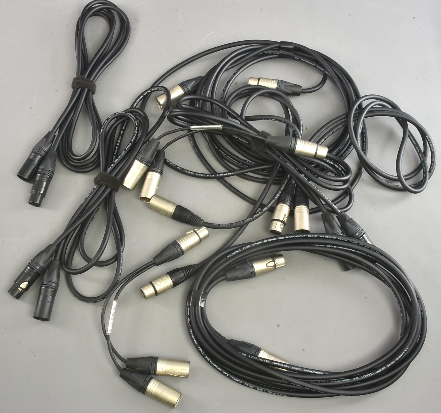 One of very many items from Calum Hunter's superb home studio. A large lot of XLR leads, many long, some Y-splitter. Packing 6GBP. |
