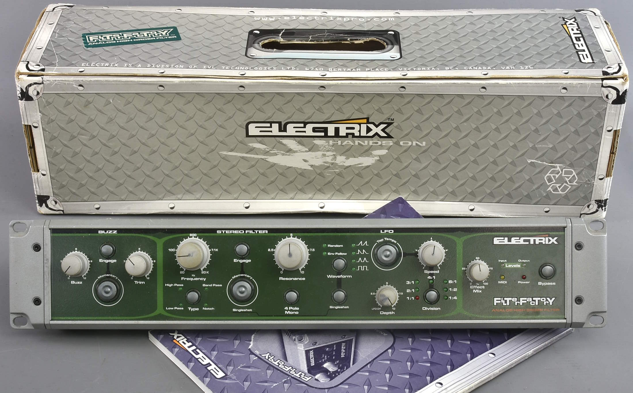 One of very many items from Calum Hunter's superb home studio. Extremely sought-after rack unit, great industrial design, serial number UK010007. With a good original manual (a bit bent from being in the box) and the original tatty box.