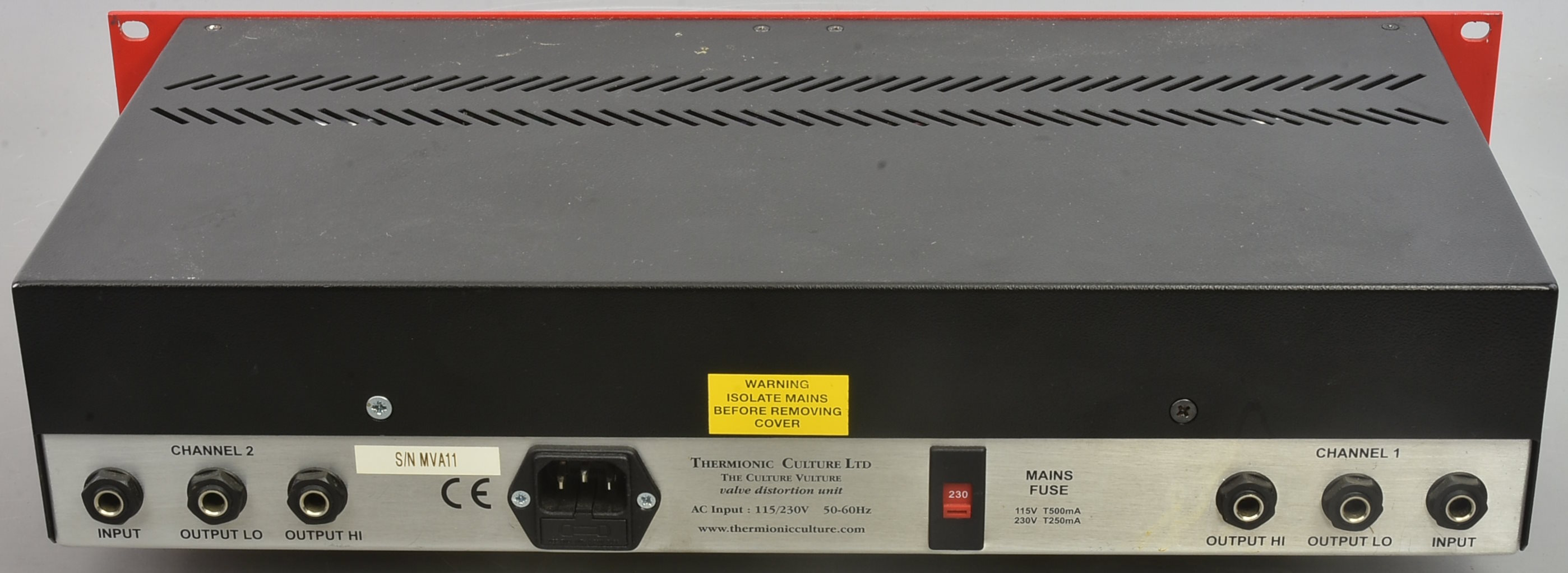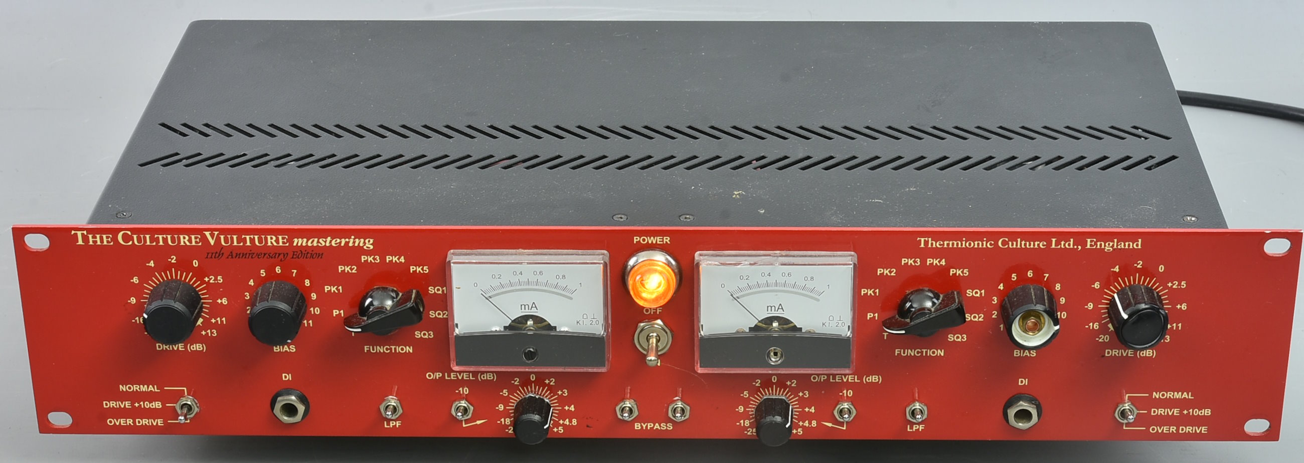 This limited edition red Culture Vulture mastering rack is, amazingly, the second of this limited edition of just 100 in this VEMIA. And this one is serial number 11 ! Either a rare chance, or more likely a special favour from the manufacturers to the owner. This would be near-mint, except for two flaws: one meter housing has a crack at the top, and one knob has an inner top bit missing. ***As a late entry this has now been checked and is in good working order. *** Packing 12GBP to include a UK or Euro mains lead. |