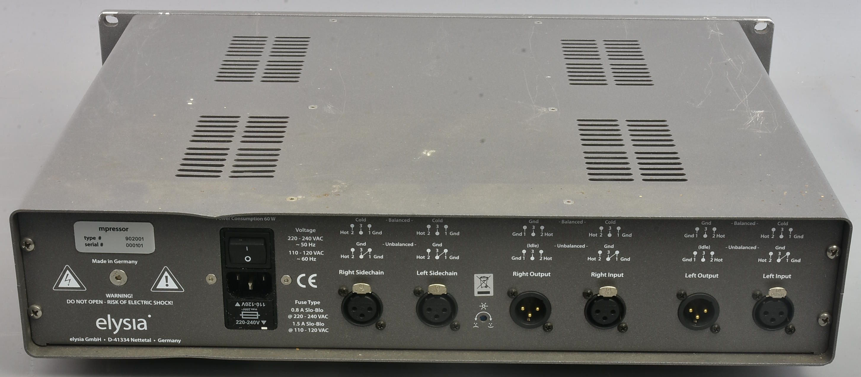 Well-respected Class A analogue stereo or dual-mono compressor. https://www.soundonsound.com/reviews/elysia-mpressor . Serial number 101. ***As a late entry this ihas now been checked at VEMIA - all good.***. Cosmetically it has seen a bit of life but is basically solid and would look good in the rack. Switchable voltage. Packing 12GBP to include a UK or Euro mains lead.