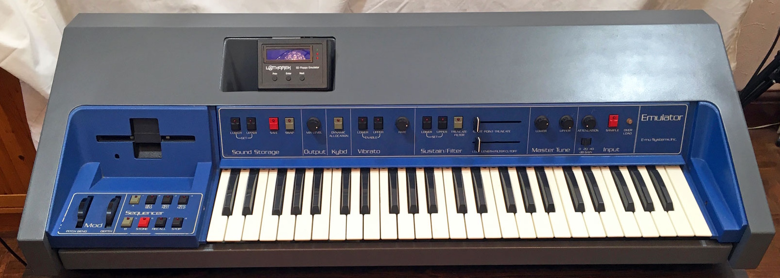 The E1 comes has been modified with a brand new HxC SD floppy emulator fitted, so it has a library loaded onto an SD card that boots up with the E1, so no floppy discs are needed. The SD card modification/upgrade was carried out by Synthprof (Andy Jury) in the UK in 2019 (original printed receipt supplied upon sale).