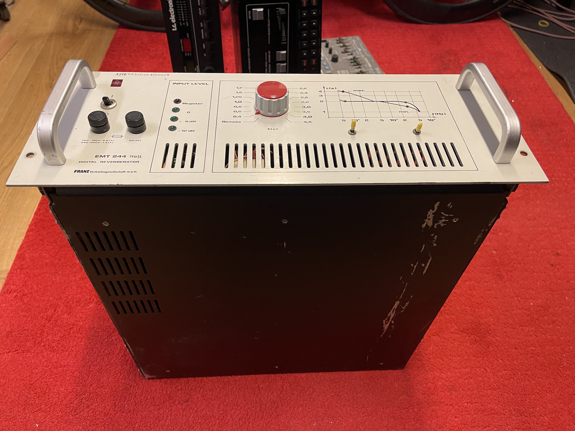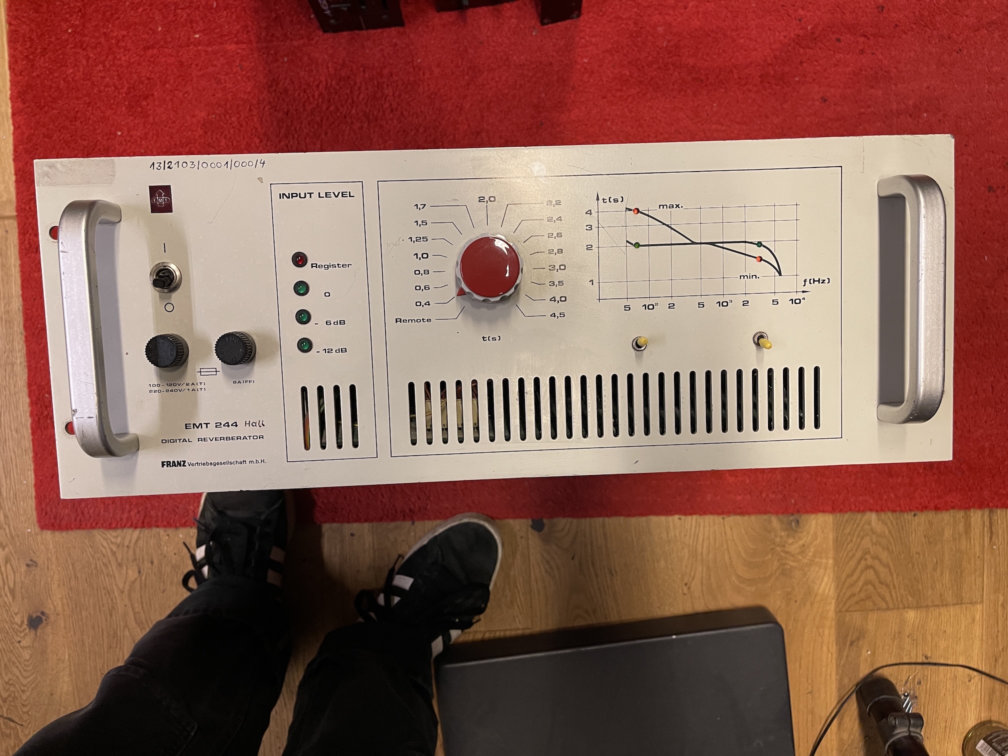 This is the absolutely epic 244 Reverb from EMT. This one was released in 1978 to provide the 250 hall algorithm for a more affordable 40,000 DM (adjusted for inflation! Unit is mono in/stereo out. Front panel controls are Decay time (selected by a 16 position rotary switch) and 2 toggles to tweak the EQing. This unit is a massive 4 rack units and 46cm deep. I bought this unit not working a few years ago and is one of two I have now working. They are very difficult to fix, this one will work for a long time now. |