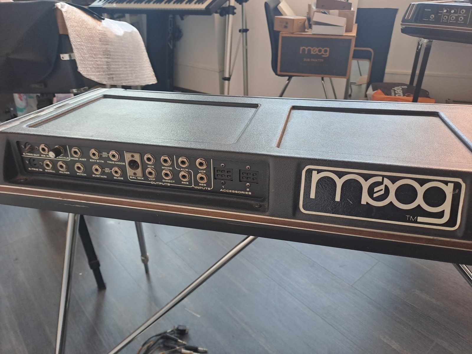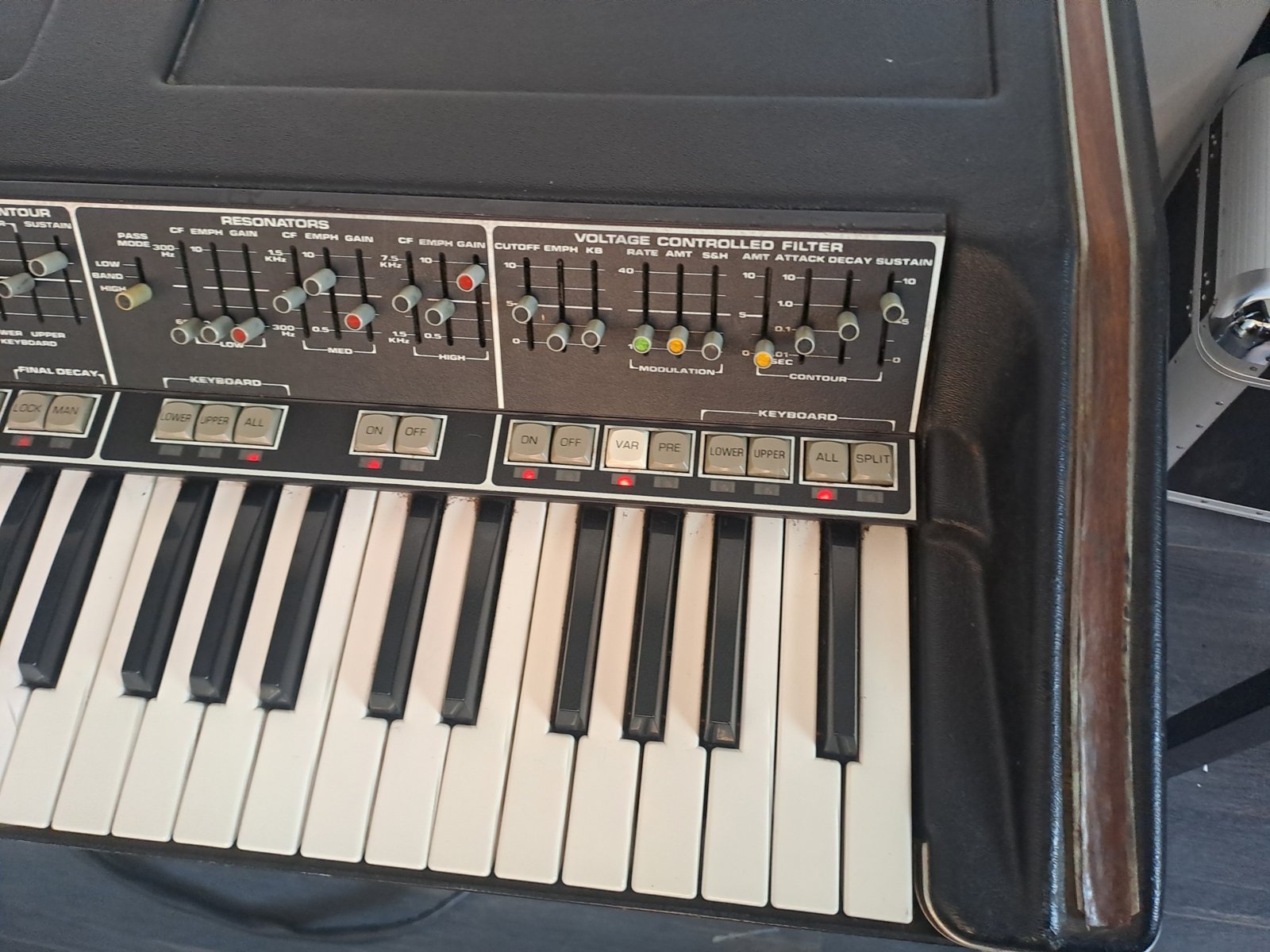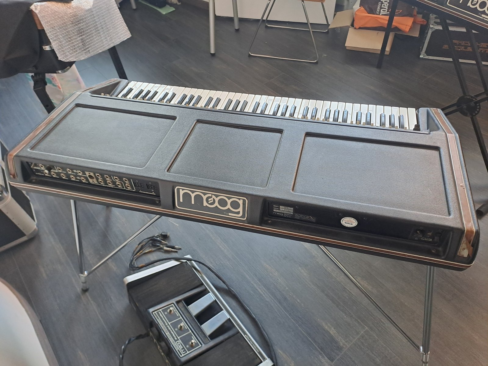 Rare MOOG Polymoog 203A with Polypedal & legs in as-is conditions, it need servicing: inside appears totally original without any service during the years, NO tracks of humudity, well manteinted and it looks amazing, digital section works as some controls, it play some presets but with a deep cleaning probably it can make more. Polypedal never tried but appears in good conditions, legs are near mint, same rhodes model |