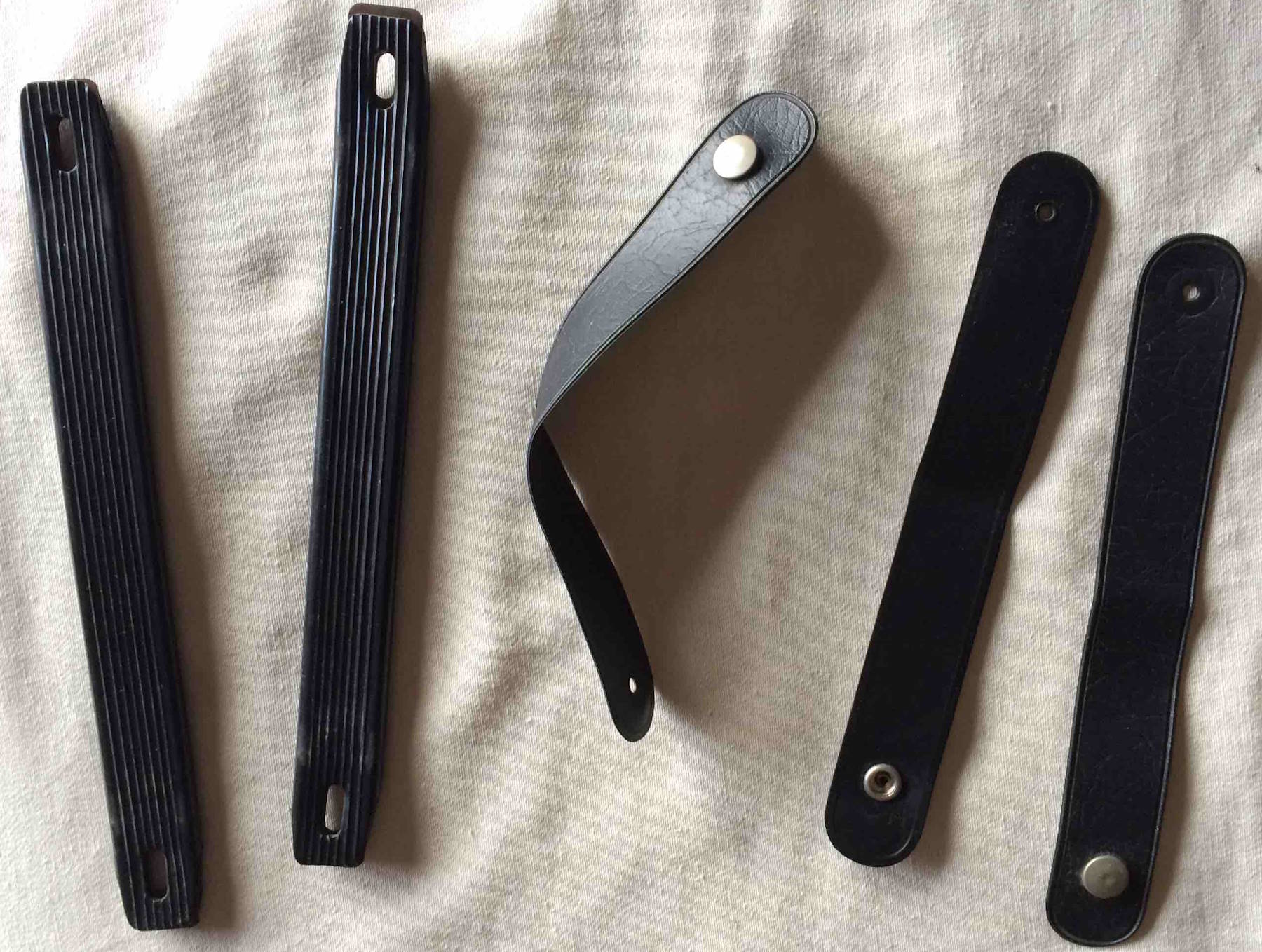 This hardware set is believed to be from a Fender Rhodes Piano Mark 1. The metal pieces, latches etc. show some signs of rust, as seen in the photos. All look solid, though. The straps look in very good condition. Packing 3GBP. |