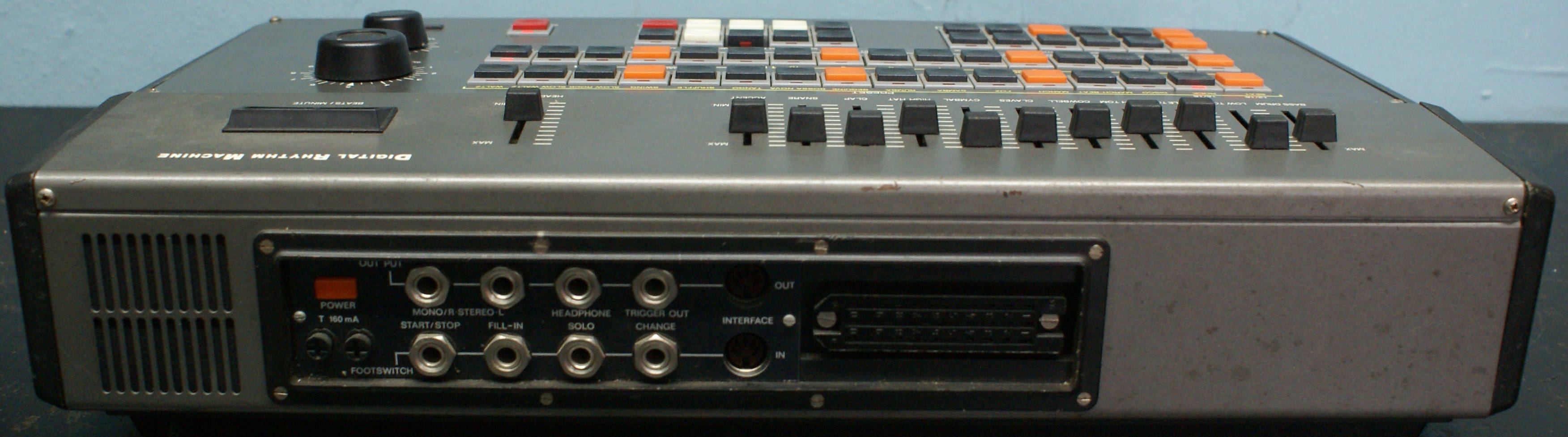 In quite good condition and working well. (note the 3 AA backup batteries are not installed). Preset/Programmable drum machine with digital control of analogue sounds. The bezel around the metronome switch is missing. 220V version with European plug fitted.