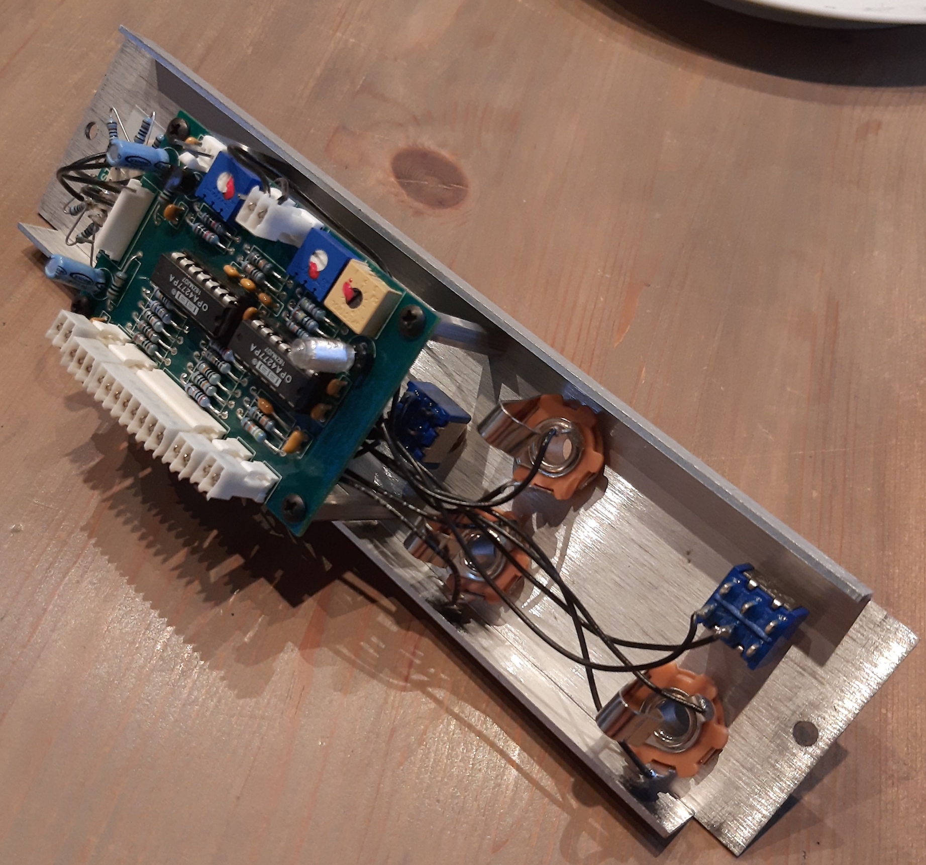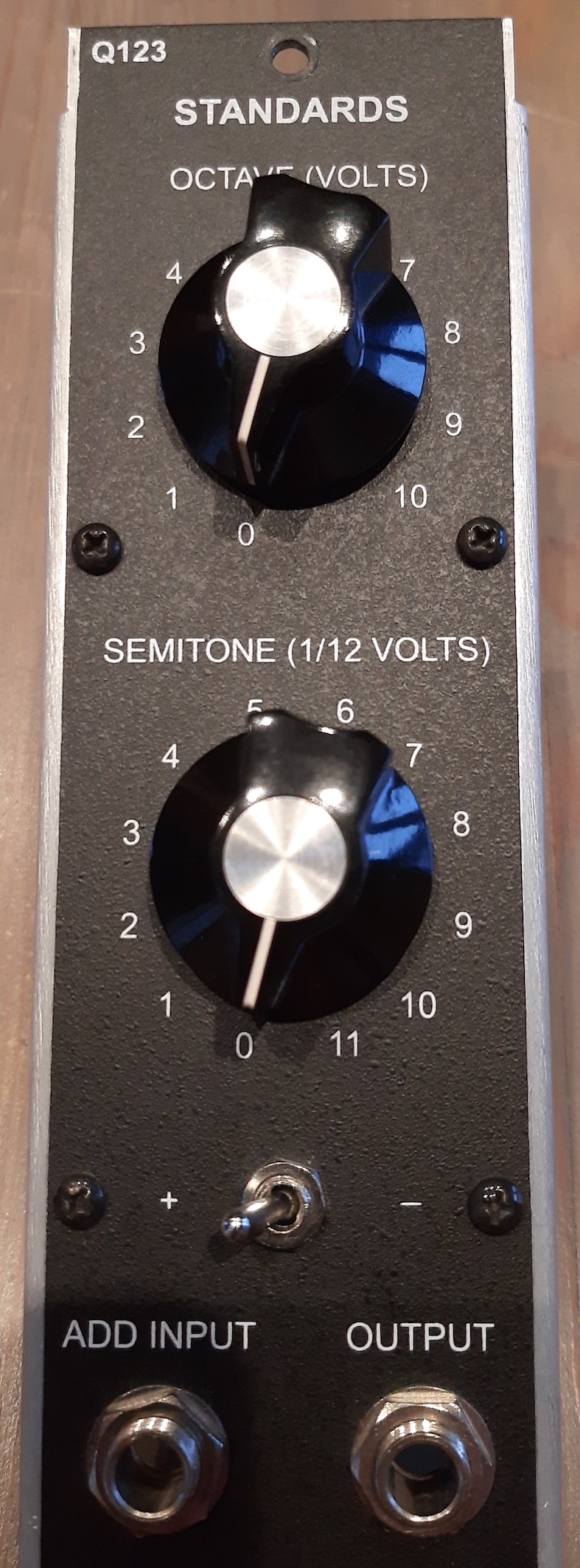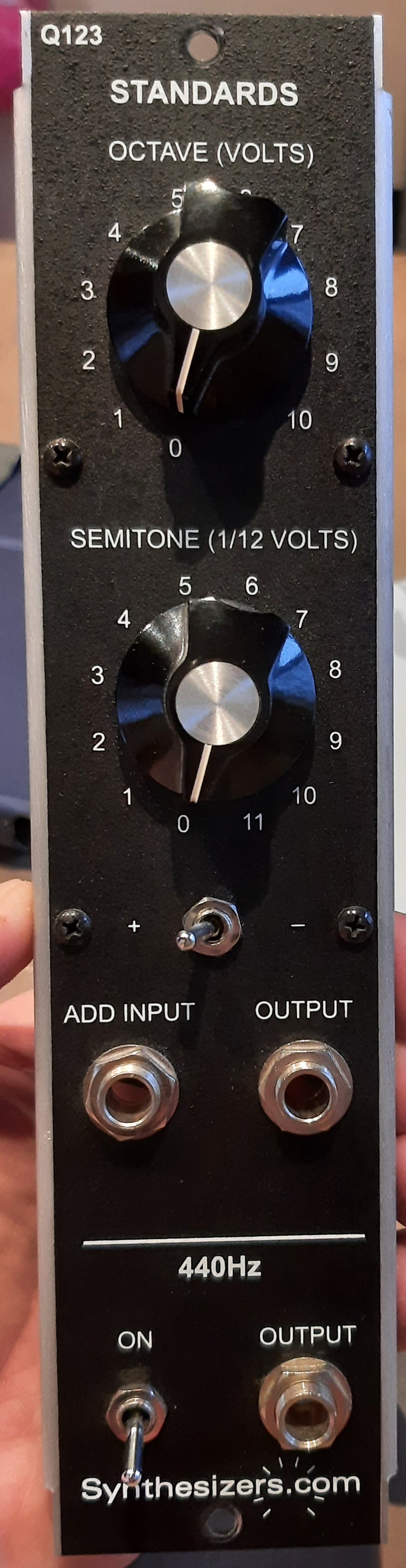 Very practical module from the Synthesizers.com line of modules: The standards module can shift the incoming CV up (and down through a switch) 0 to 10 octaves, and transpose incoming CVs to any key in the 12-tone system. You can also use the module to generate CVs without any input. Output choosen by the two multiswitches, see photos. In addition it has an 440Hz tune tone (just like on the minimoog) with an on/off switch. In very good condition, and has seen little use. I no longer need the module, but I need the space in mo modular, so it has to go. Standard dotcom power connector (+/-15 volts). Recently calibrated to factory specs. |