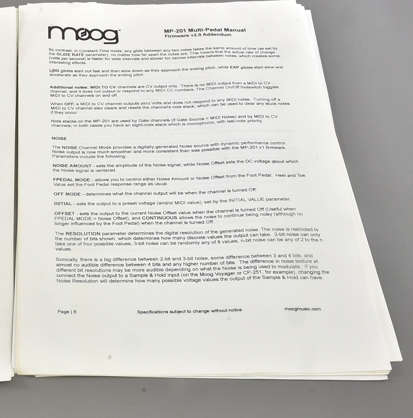 For anyone lucky enough to own this rare and sought-after piece of Moog gear, the MP-201 Multi-Pedal, here's the original manual and the version 2.0 firmware addendum. Very useful for getting the most out of this powerful little box. |