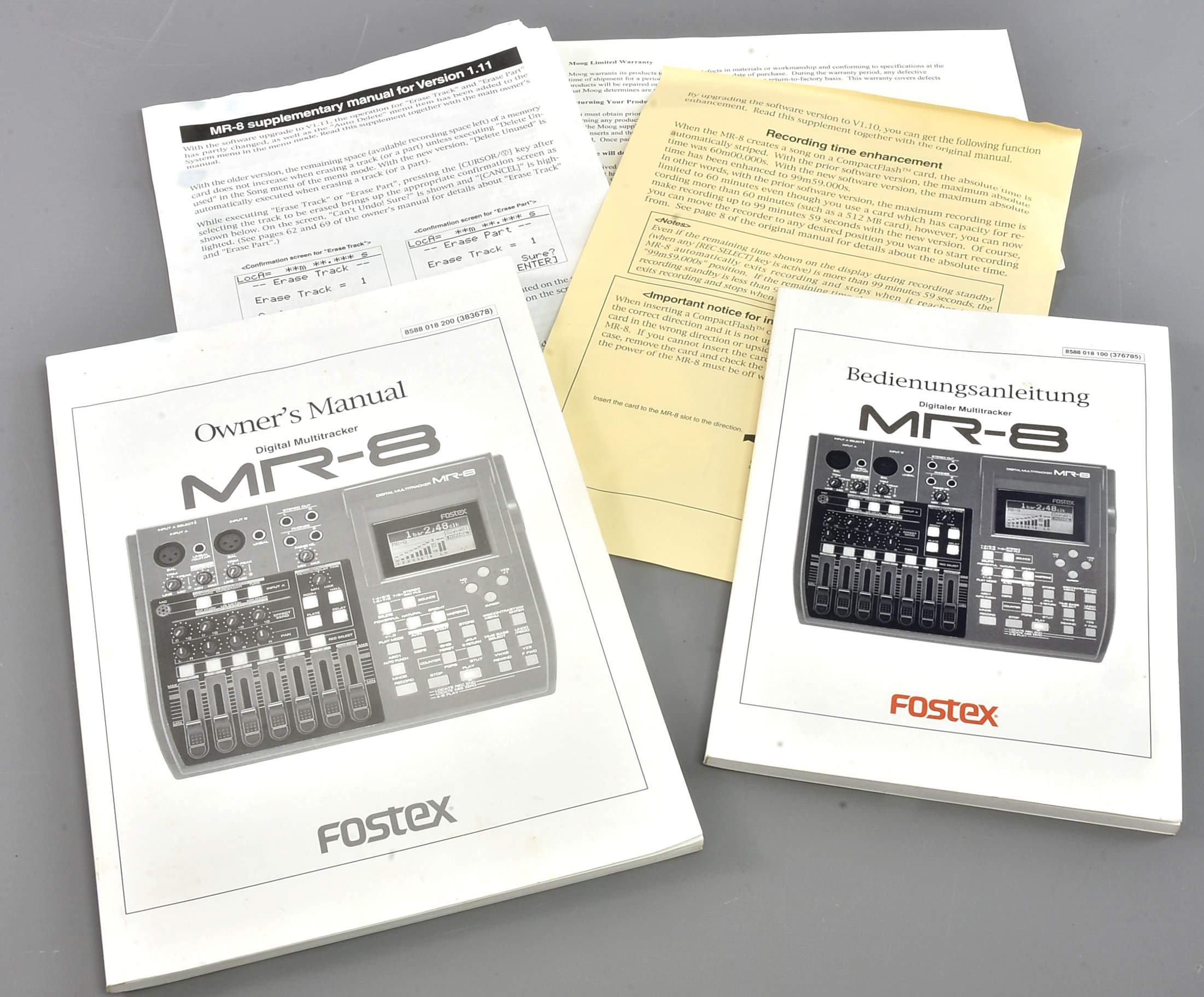 Original MR-8 manuals in English and German, and supplementary manual for version 1.11. Some paperwork for the Moog Prodigy seems to have slipped in as well. |