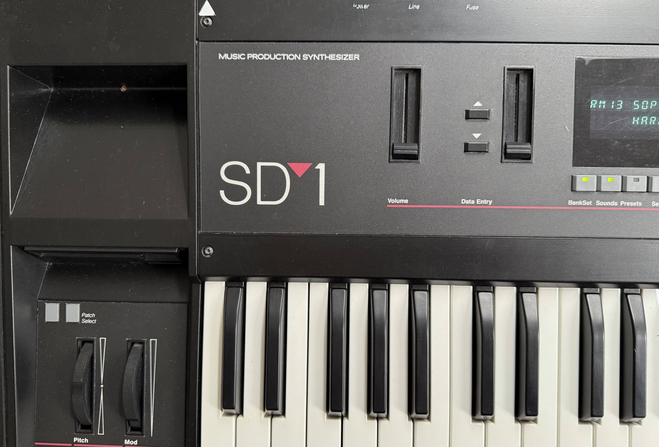 Ensoniq SD1 - one of the last Ensoniq transwave synths. Polyphonic aftertouch is still working. Also comes with the Synthsquare SC-2048 memory card that can store up to 16 banks of sounds worth €220 on its own. VEMIA can collect and pack: 24GBP.