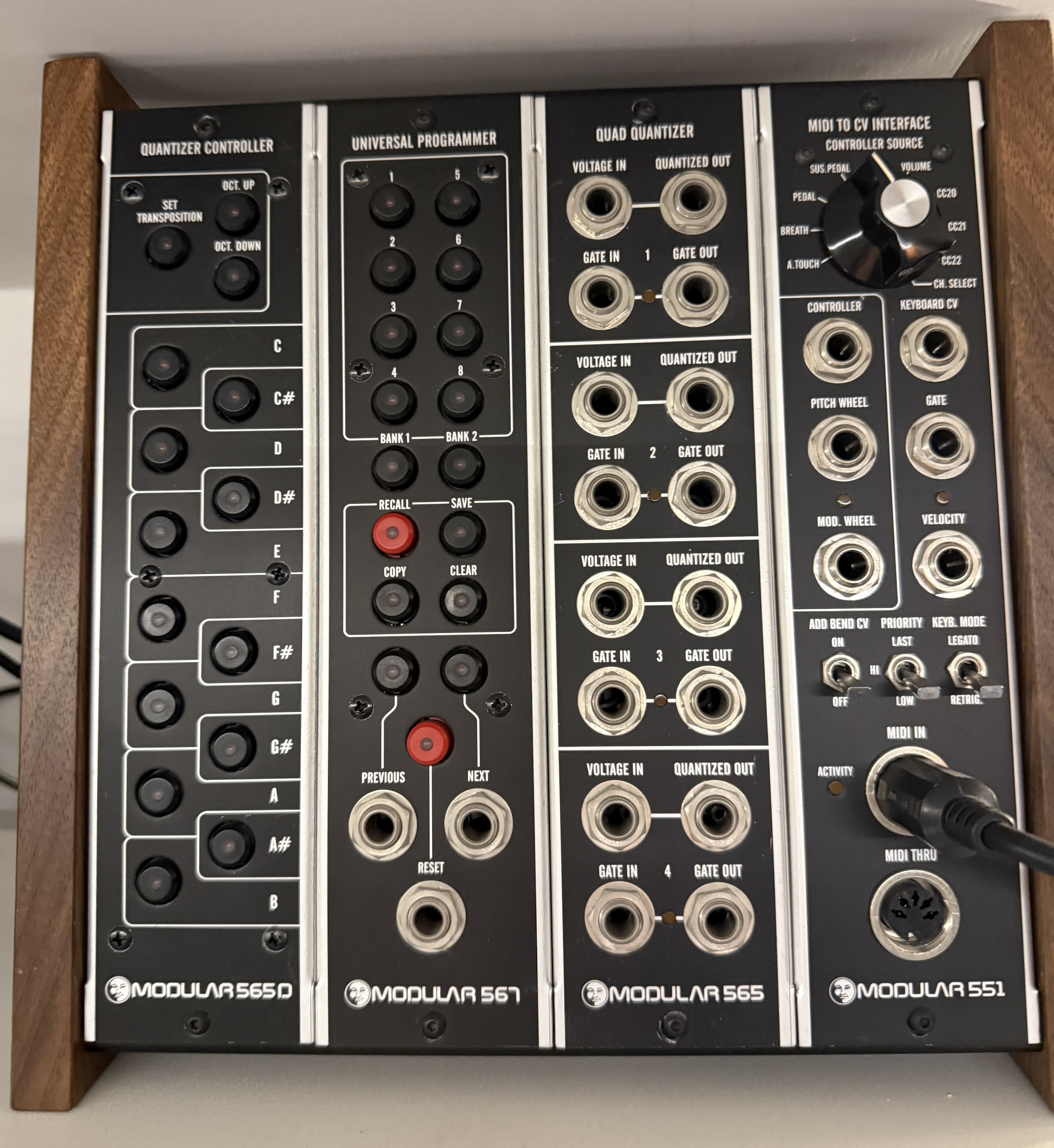 or software-sequencers/DAWs. The 565 is a quad-quantizer, that adjust the CVs into semitones, while the 565 D is a controller that limits those CVs to any desired key, chord or note interval using the array of the 12 keyboard-like push buttons that activate them. The 567 Universal programmer offers 2 banks of 8 memory slots each, to recall the 565D scenes. I can provide the pdf of the explanation, if needed., Unfortunately, Gert, the friendly and genial engineer who led Moon Modular passed away some years ago and these modules are no more on the market. A rare opportunity to get them at half the price. Never used. |