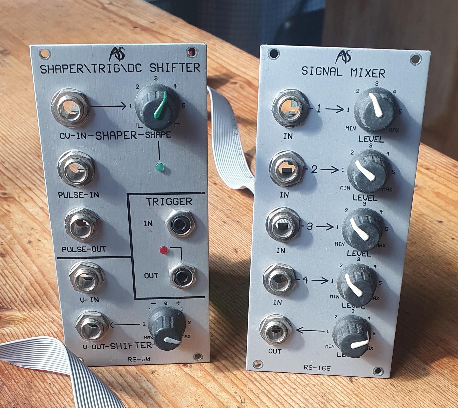 RS50 trigger generator/pulse shaper/DC shifter (Trigger I/O minijack) and RS165 4 into 1 mixer, both professionally modified with full size jack sockets. Tested and fully functional. EX Redshift