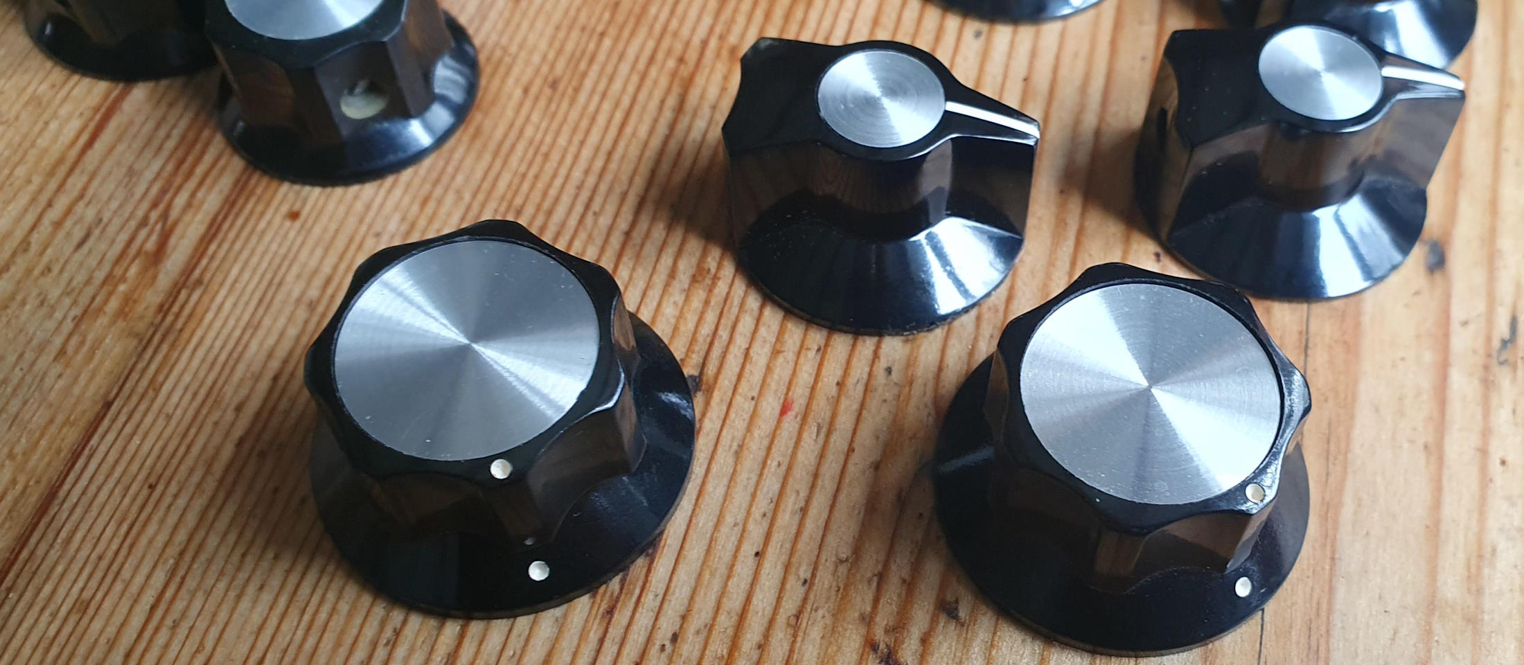 Now a full Set of Cosmo Minimoog knobs with 6 pointers and 2 Oscillator 2 & 3 knobs - they are near new - although they are new old stock have a few minor marks on the silver dials as they wear lose in a bag originally.