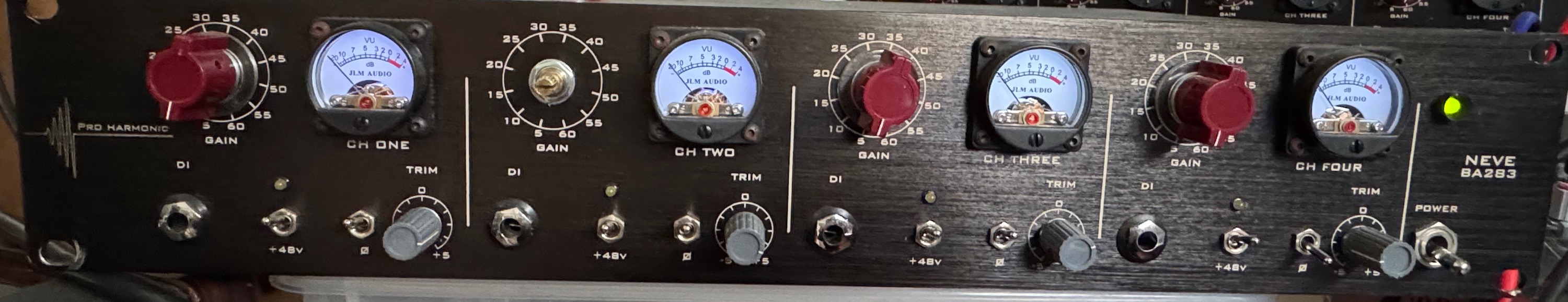 Custom designed four channel mic-pre/DI using fully refurbed Neve 183/283 cards from Vintage Neve modules. Each channel has Stepped gain pots, trim, 48v & phase reverse buttons. The DI section is made from JLM Fet DI cards.