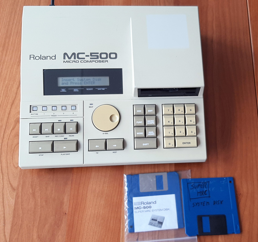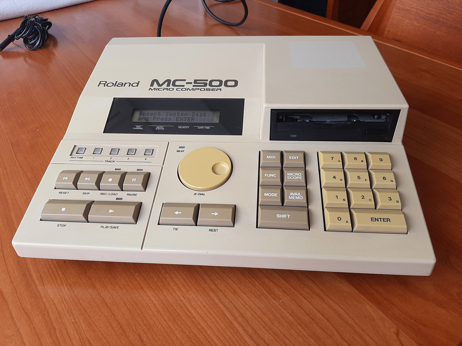 Roland MC-500 MicroComposer in good working order. 1986 hardware sequencer featuring a 3.5-inch floppy disk drive, Including operating System Floppy OS for Roland