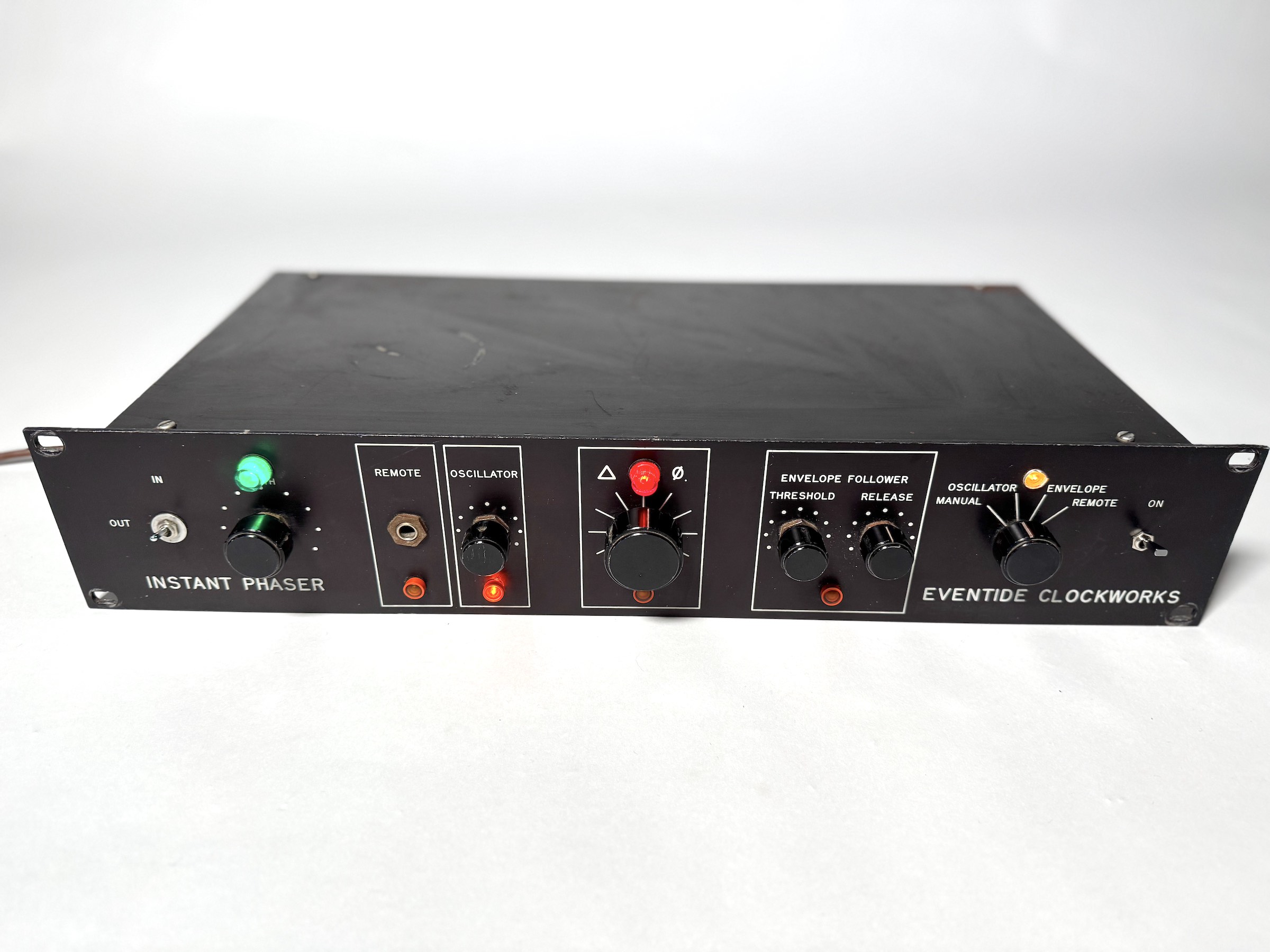 The Eventide Instant Phaser is a classic early phaser with a distinctively organic sound. It was very recently serviced with a new mains switch and all the lights are working with incandescent bulbs as it should be. I have enjoyed the pulsing glow in oscillator mode in my studios for nearly 30 years regardless of whether it was being used on a session or not and would highly recommend this mode of operation. Some cosmetic wear as you can see but all in all a thing of dusty beauty in a sterile age of digital emulations.. Included in the sale is a bound copy of the manual with circuit diagram which Eventide sent me long ago. PS external CV control possible with this. |