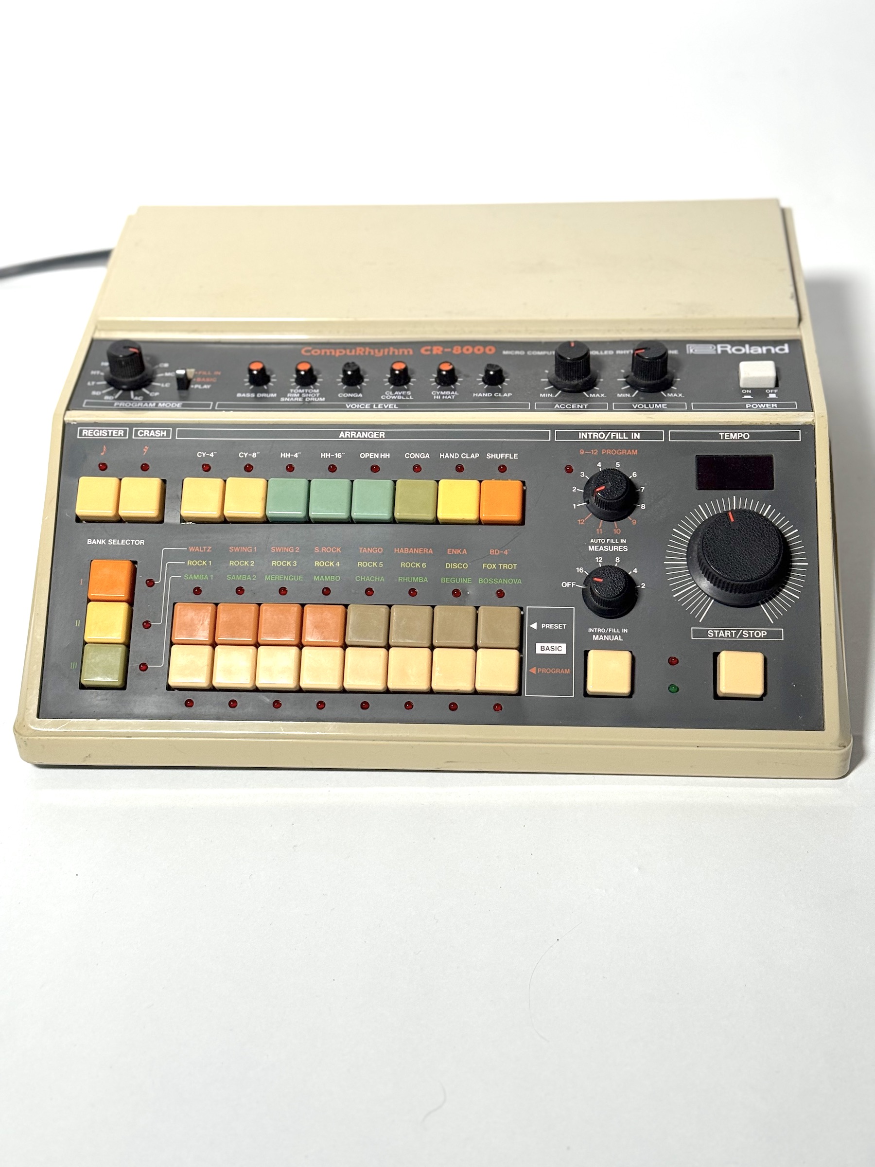Classic Roland drum machine with programmable function and a few tricks up its sleeve. Very good working and cosmetic condition besides a couple of the small knob caps. |