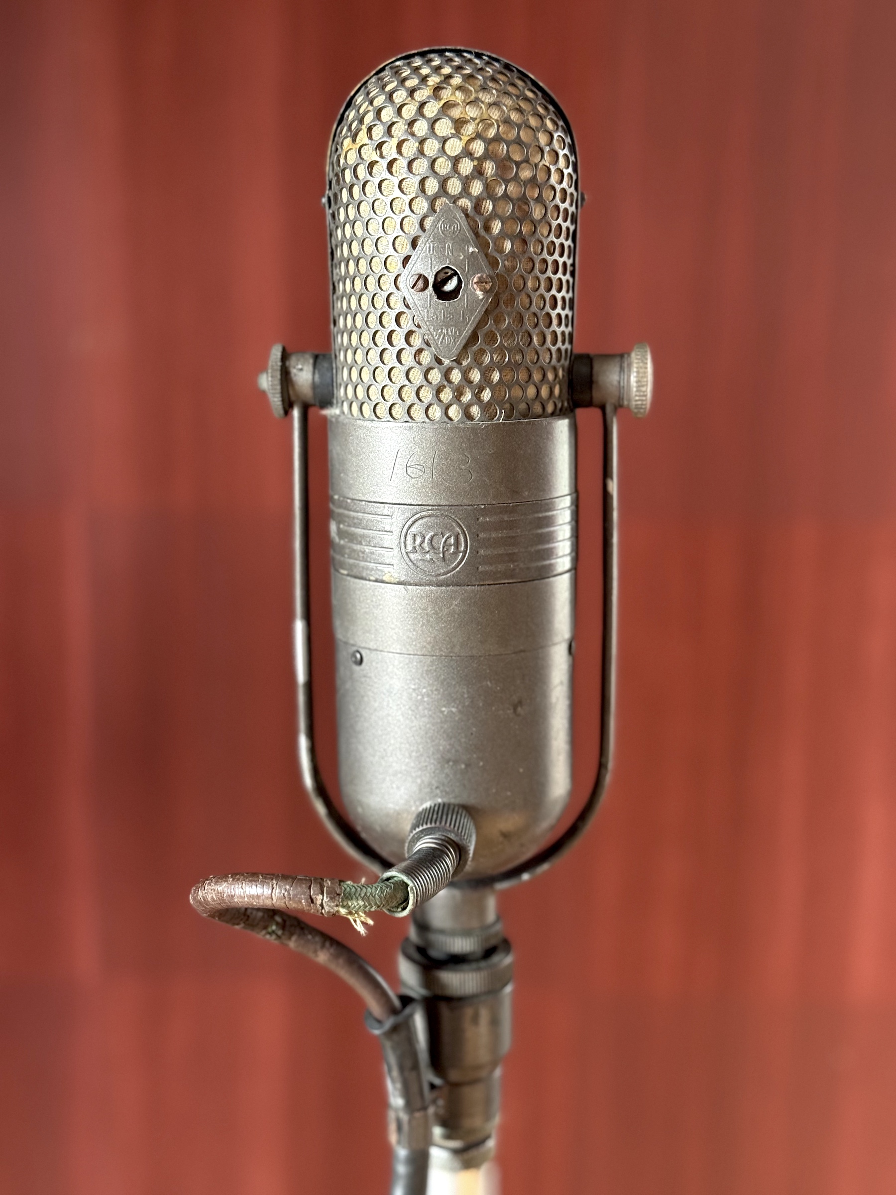 Vintage RCA 77DX possibly from the late 1950s or early 60s. Matte version for film. Beautiful sounding cardioid ribbon microphone, warm with silky detailed highs. A veritable workhorse on voice and instrument alike. Only points I can think to note - the cable is showing signs of wear but doesn't affect operation and there is a number scratched on the rear of the mic which is more likely an inventory number than the serial number. |