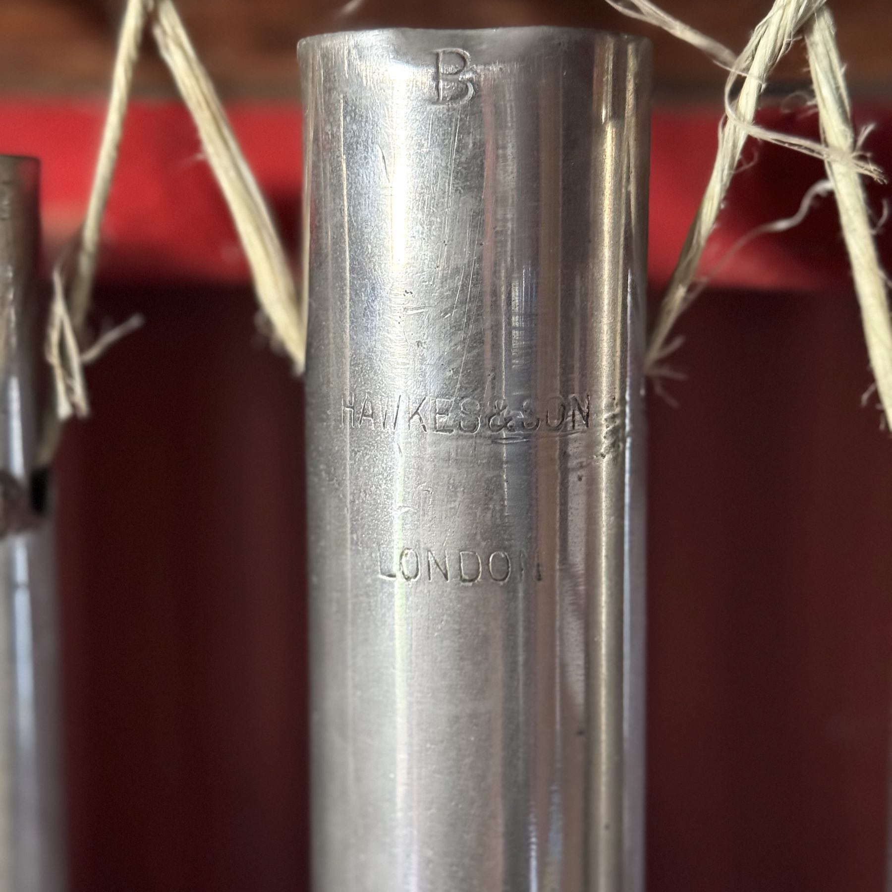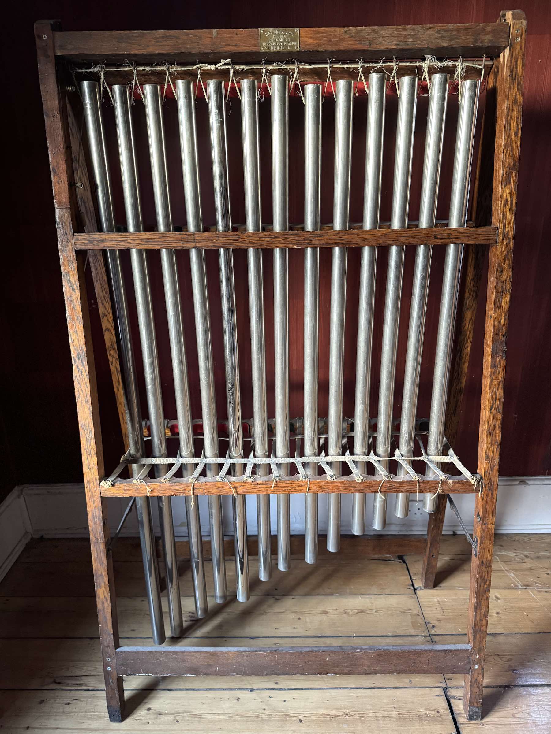 Extremely rare set of antique folding tubular bells dating from the 1920s as the company merged in 1930 into the now famous brand. The webbing is possibly a military addition - at least it looks that way to me. This set of bells was restored for me by Paul Jefferies of Orchestral Percussion about 20 years ago and one bell was replaced (a Hawkes bell nonetheless!). Sounds wonderful and has given pleasure to a lot of musicians over the years. |