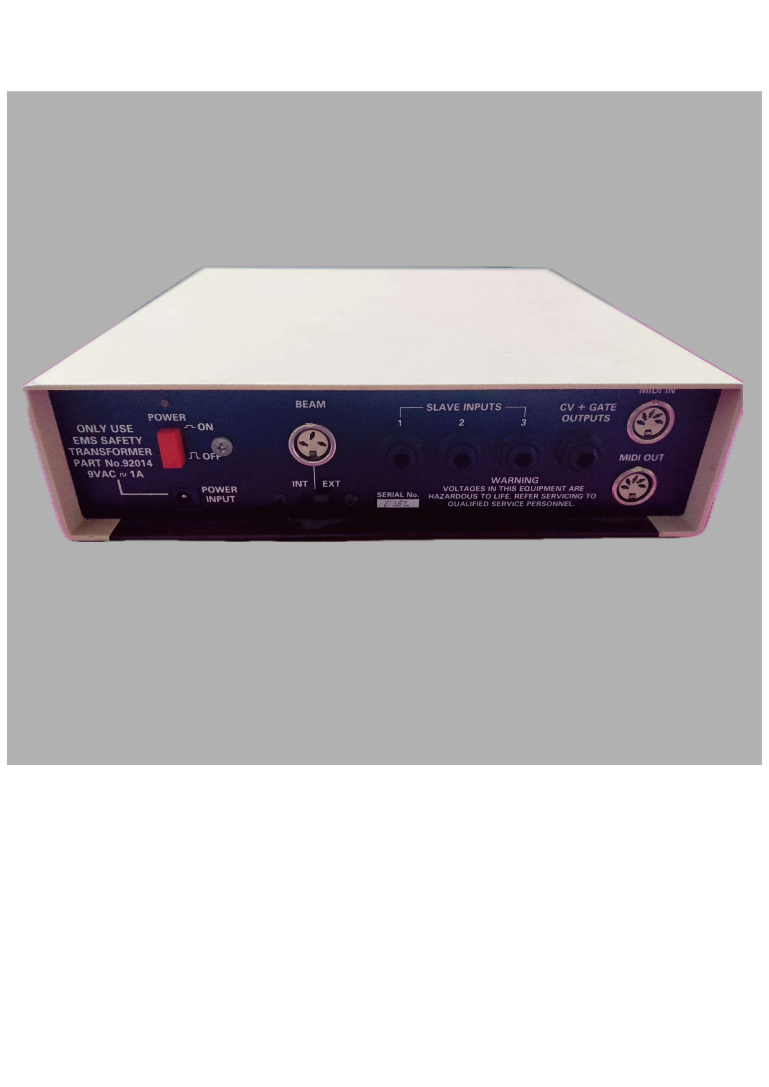 here im selling a very nice example of the ems sound beam master mark 1 . this is the model with the beam sensor build into the front panel ready . it does have connections for additional beam sensors on the back which are additional product this is the main unit only . also on the back are the connections for midi in and out and cv gate . it comes with external powersupply .