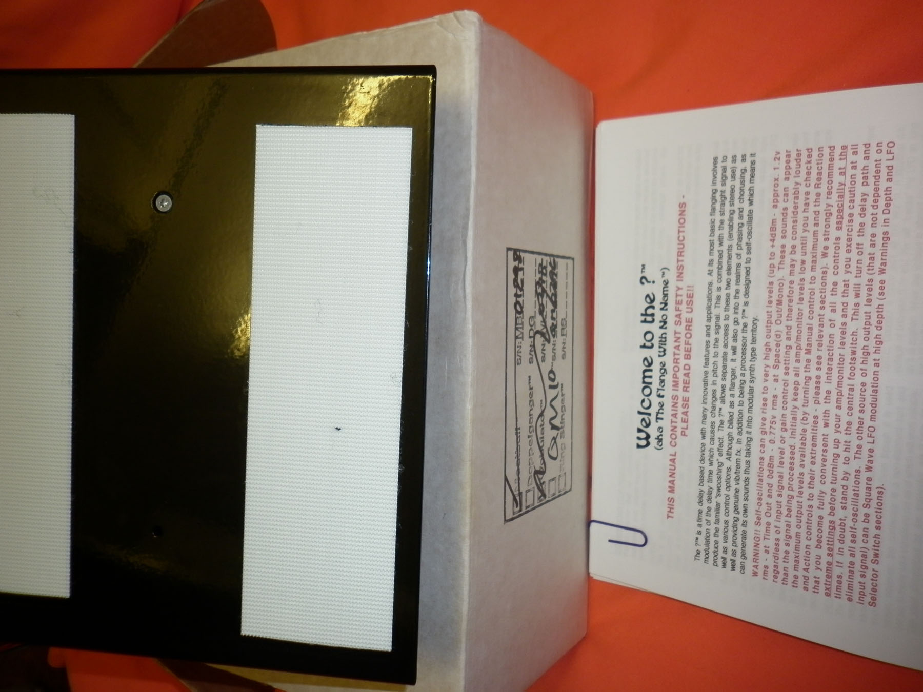 Manual and setting sheets mint. Dan has made a new lightjack for this as an extra, and also made up a battery clip / 2.1mm DC plug so that the flanger can be used with a PP3 on the fly - it is pretty power-hungry, so wasn't battery powered as standard. Packaging VG but not near mint - some scribbles and sellotape/wear.