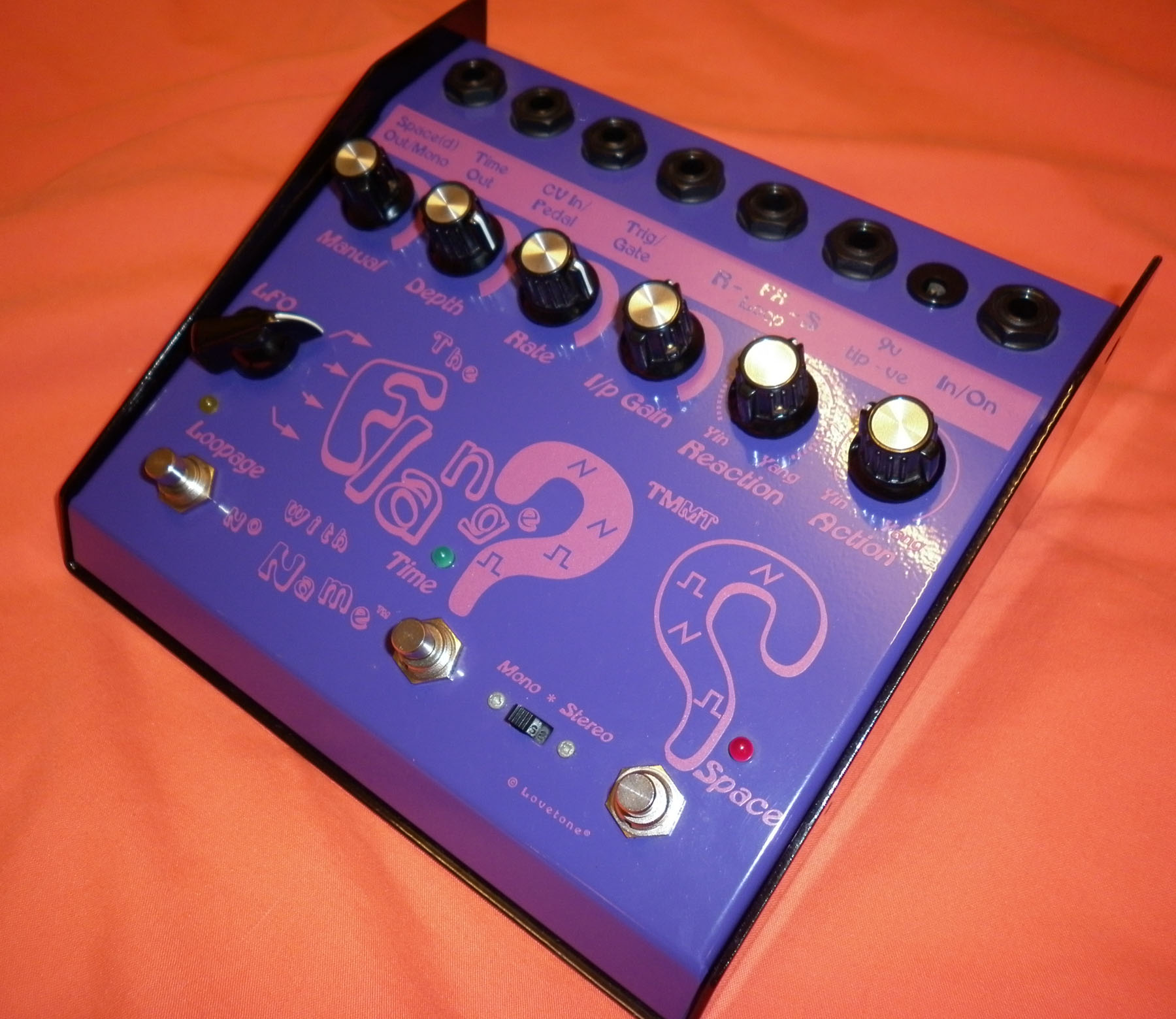 Lovetone designer Dan Coggins' cherry-picked Stereo Flanger (?/ Question Mark/ “Flange with no name”) - s/n 0010 – stereo flanger/chorus/vibrato/pseudo-monosynth with voltage controllable delay via external pedal input and syncable l.f. oscillator via trig/gate input. Triangle and square wave modulation. Mono and Stereo modes. FX Loop in delay path for inserting digital or tape delays for ultra-sci fi effects. Amplitude phase modulation of straight path synced to LFO as well as reversible harmonics and feedback on controls.